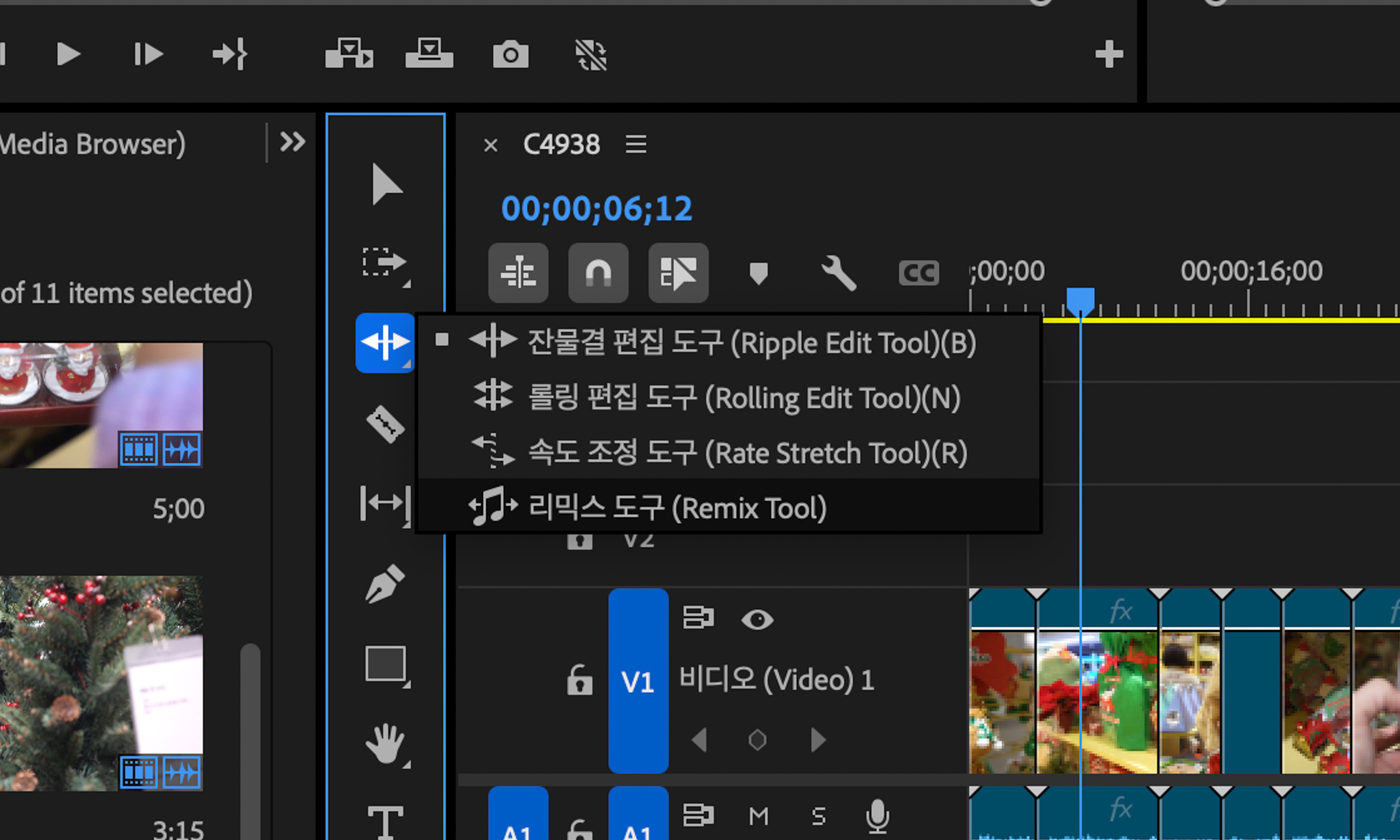 리믹스 도구는 타임라인 툴 바에 숨어 있는데 위에서 세 번째인 ‘잔물결 편집 도구’를 길게 꾹 마우스로 눌러주면 위와 같이 선택 가능한 메뉴가 나옵니다.