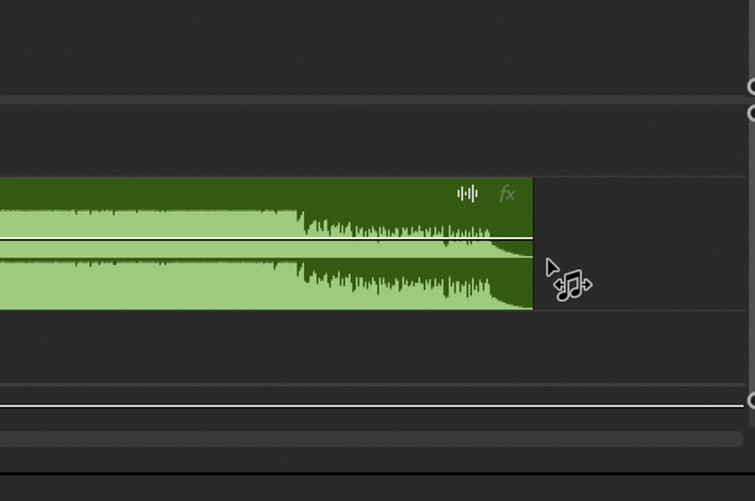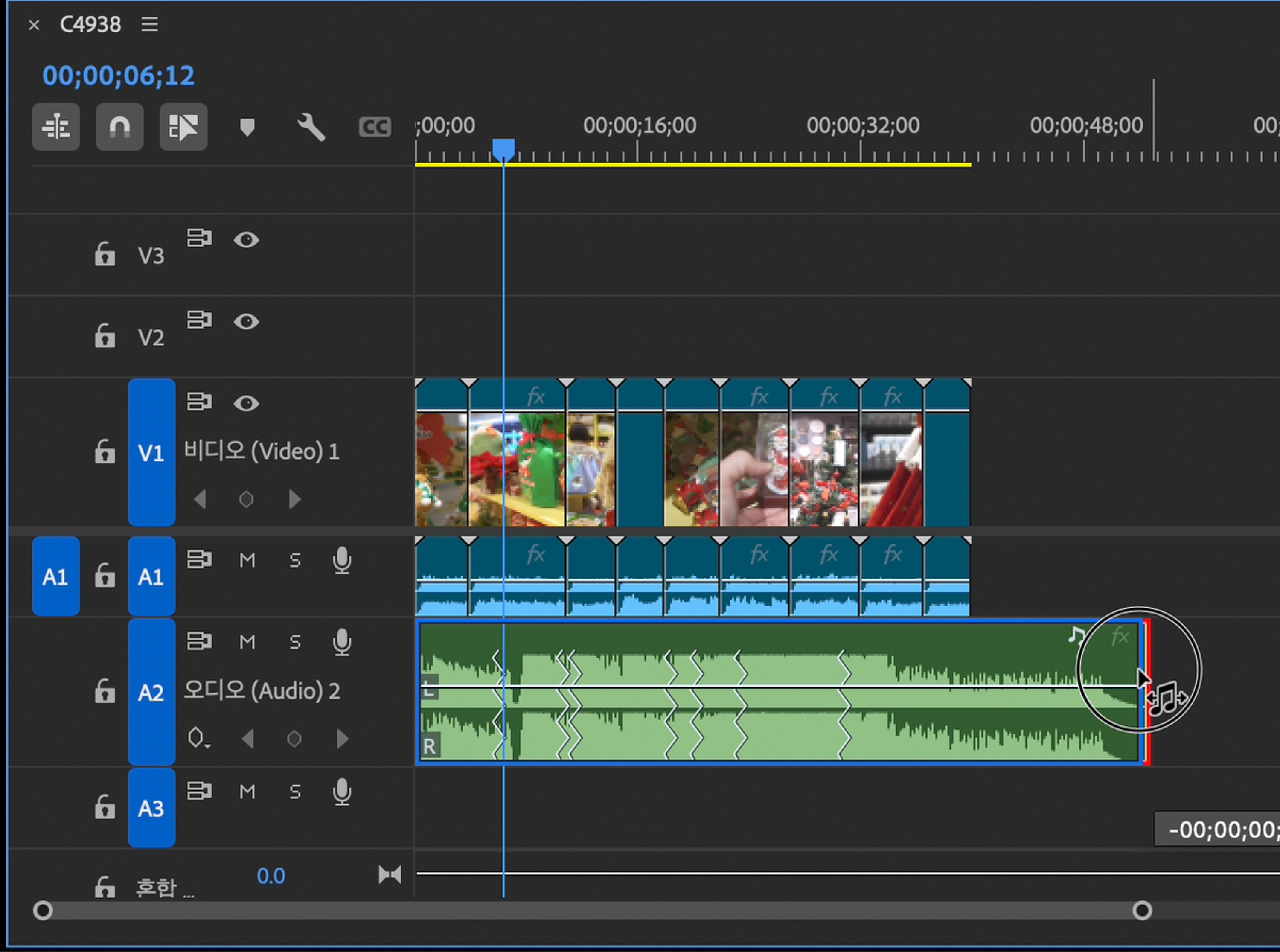 배경음악의 끝부분에 커서를 올리면 위와 같이 음표 모양의 포인터를 볼 수 있습니다. 마우스로 선택하여 영상의 길이만큼 맞춰 주면 됩니다.
