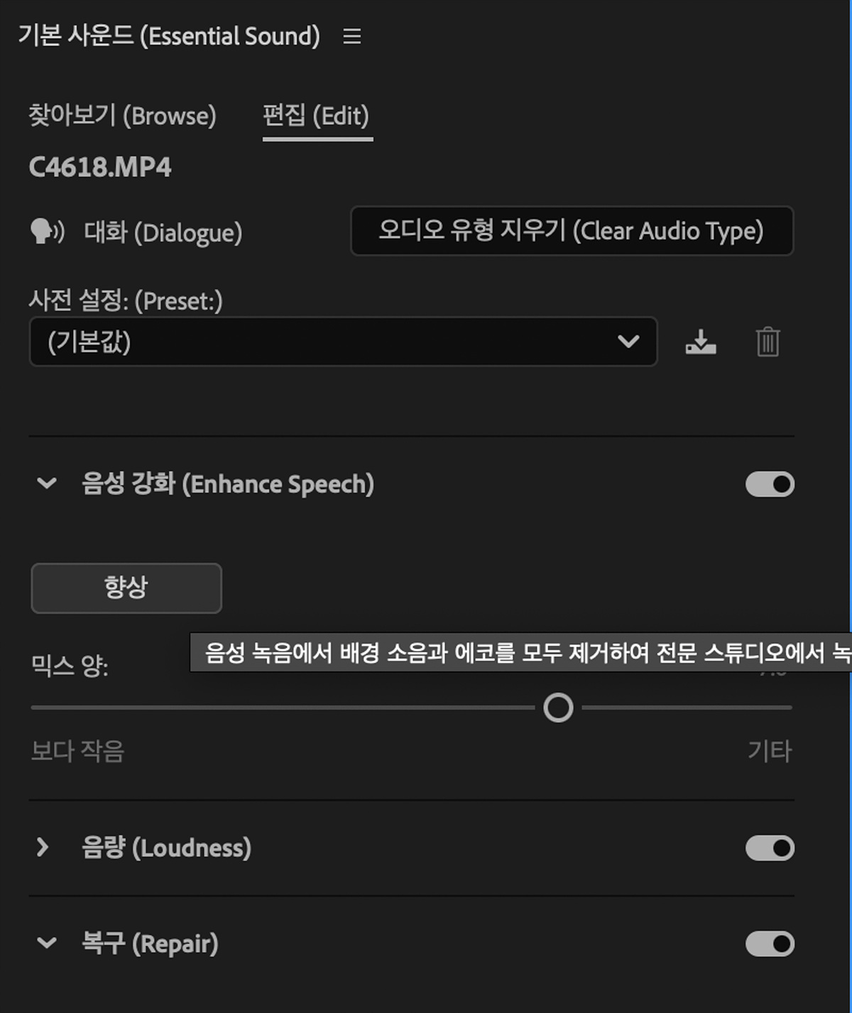 전문적인 오디오 엔지니어링 기술이 없어도 품질 높은 오디오를 구현할 수 있는 기능들이 모여 있는 패널입니다. 손쉽게 오디오 보정을 할 수 있습니다.