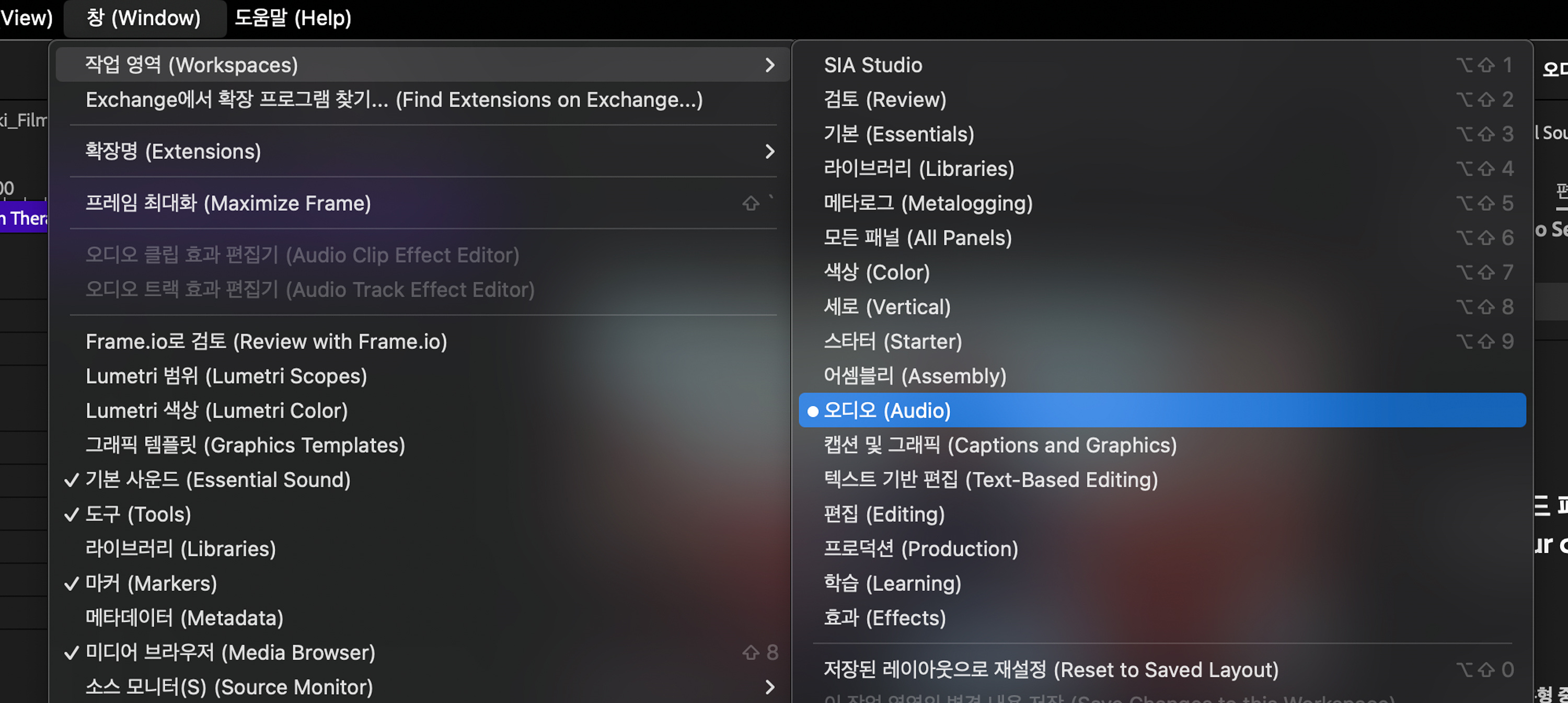 기본 사운드(Essential Sound) 패널을 열기 위해서는 바로 ‘창(Window) > 기본 사운드(Essential Sound)’로 패널을 열 수도 있지만 ‘창(Window) > 작업 영역 > 오디오(Audio)’로 이동해도 됩니다.