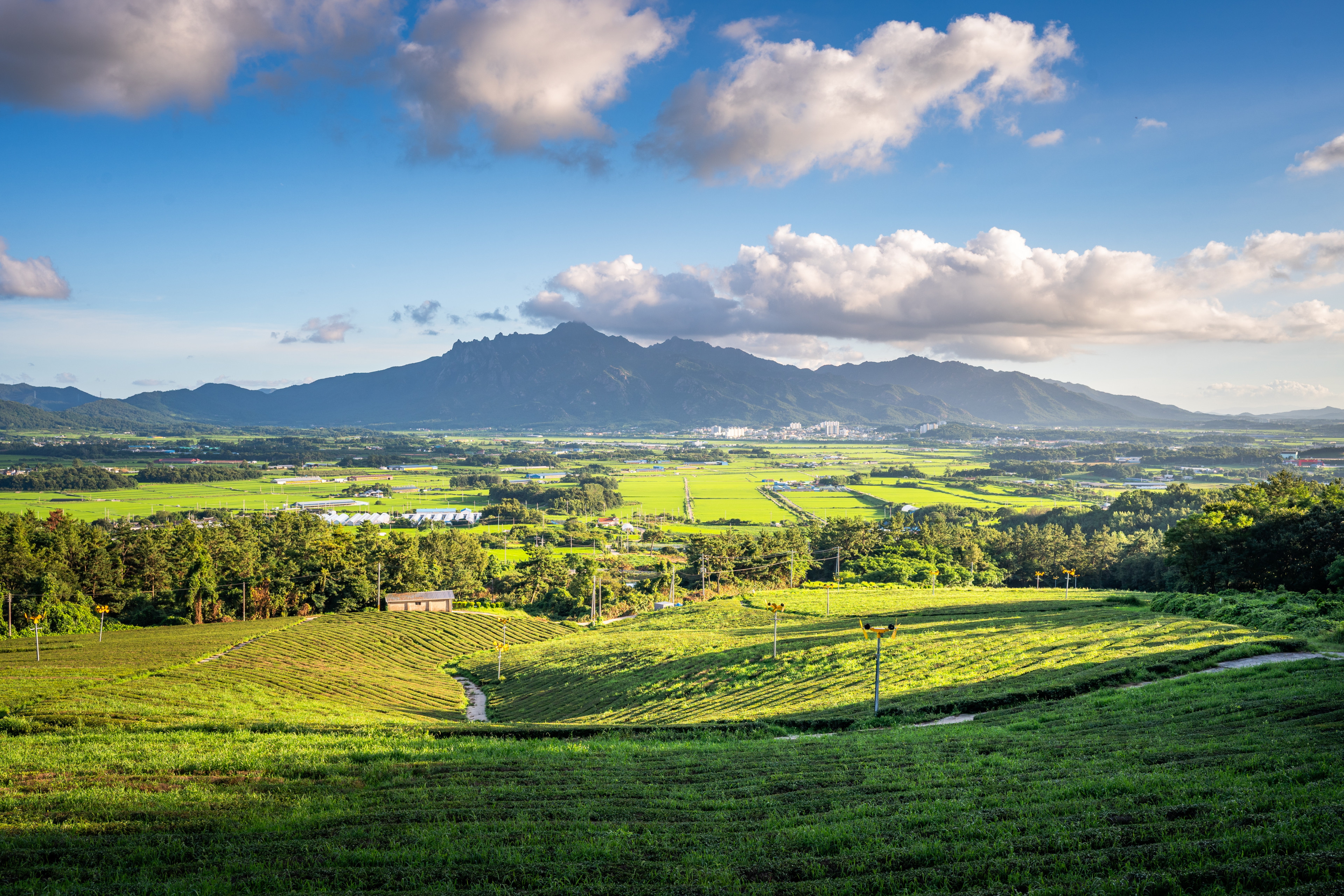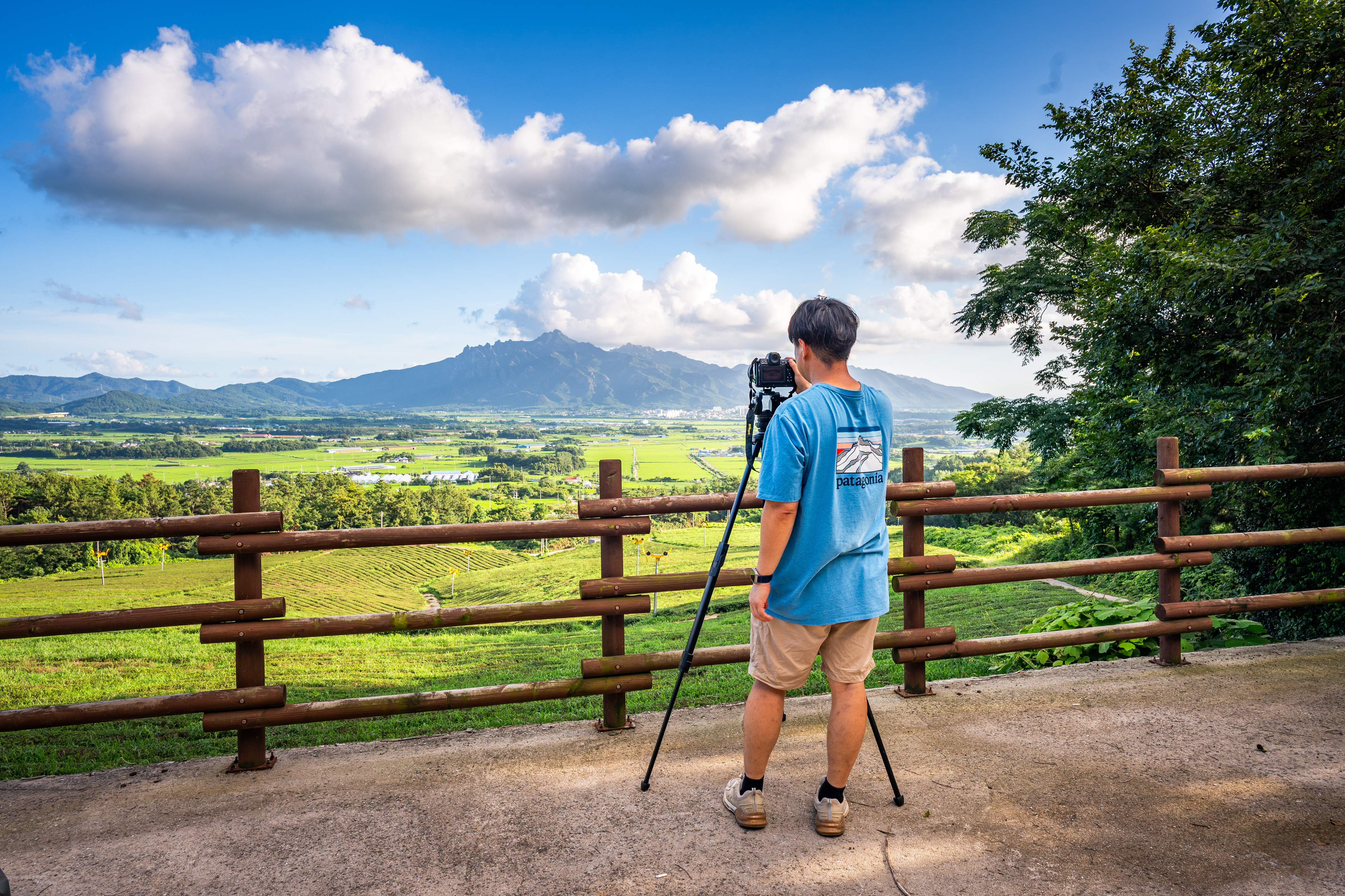 다원에 전망대가 있습니다. 차는 아래에 주차하고 천천히 걸어 10분 정도 경사를 오르면 전망대가 있습니다. 여기서 바라보면 월출산의 동쪽과 영암의 논들. 그리고 녹차밭을 함께 조망할 수 있습니다. 8월이라 녹차밭 수확이 끝나고 검게 그을려 있었지만 그래도 나름 볼만한 풍경을 선사해 줍니다. 여기는 5월에 녹차밭이 푸를 때 찾아오면 멋진 풍경을 만날 수 있습니다. 아니면 논이 누렇게 익을 10월 가을에 오시면 또 다른 풍경을 만날 것 같네요. 이렇게 우리나라는 사계절이 뚜렷하기에 계절에 따라 보는 풍경도 많이 달라서 풍경 사진 찍는 것도 즐겁습니다.