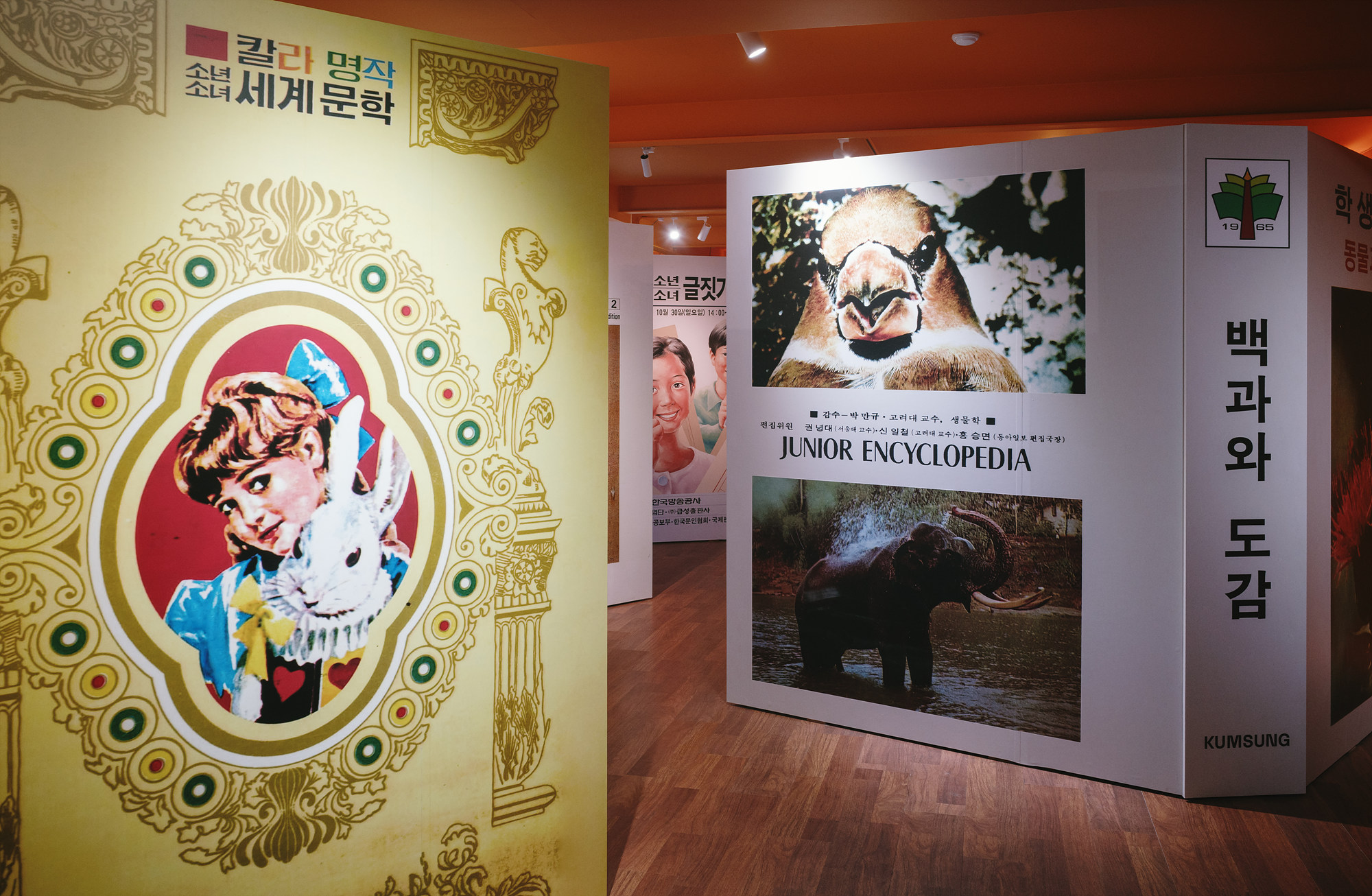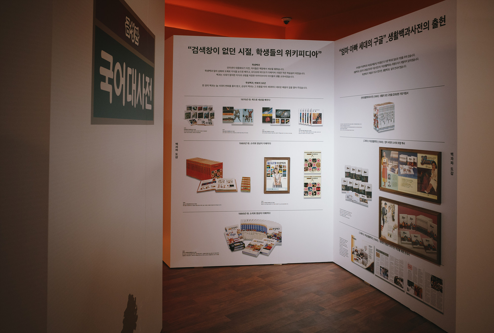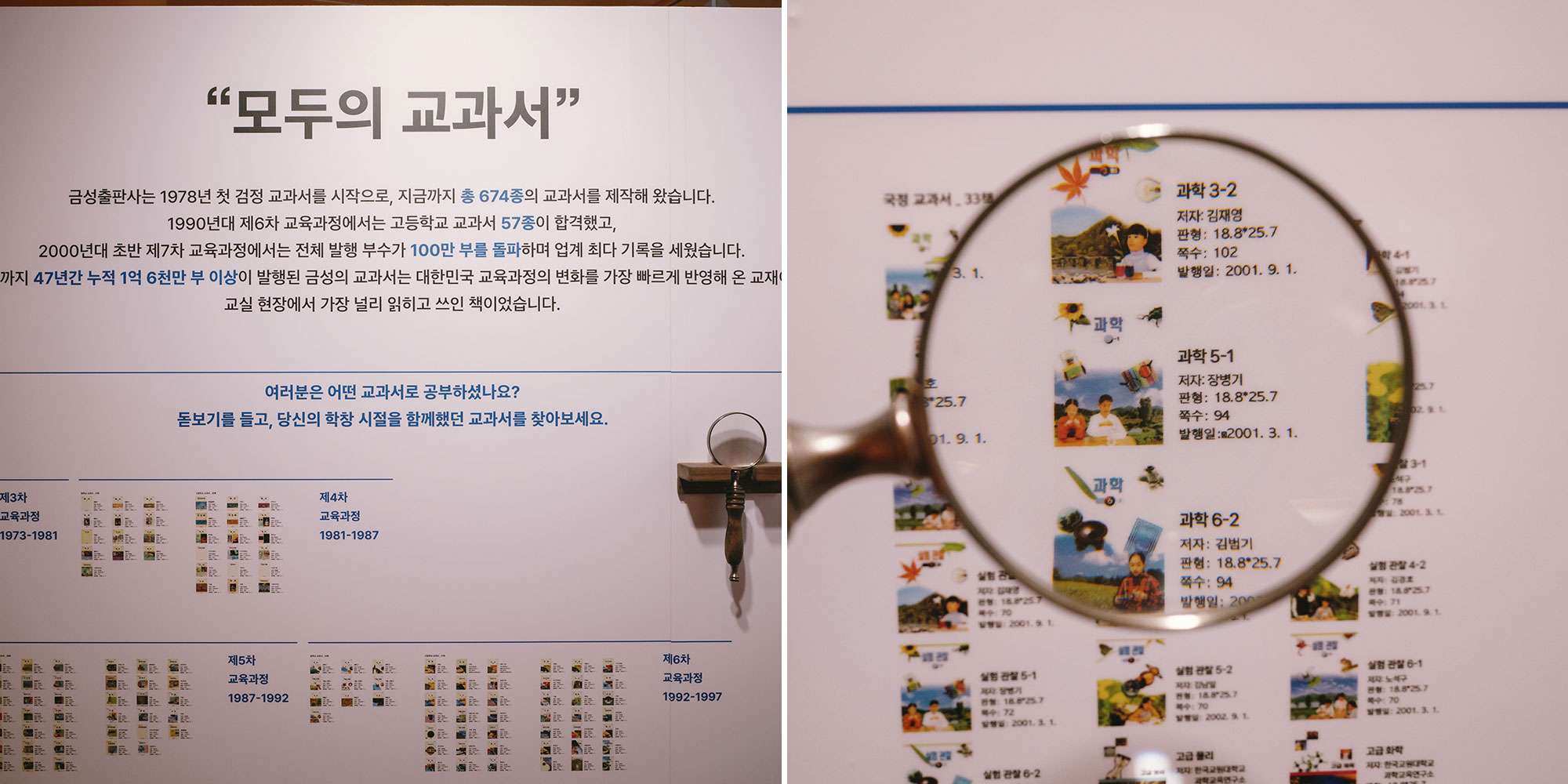 마지막으로 전시의 하이라이트인 '책의 미로'는 금성출판사가 걸어온 60년의 시간을 거대한 설치물 형태로 재구성한 공간이다. 관람객은 책 사이를 걸으며 출판사의 발자취와 시대의 흐름을 따라가게 된다. 단순히 '보는'전시가 아니라, '책 속을 직접 거니는' 경험이 인상 깊었다. 사실 처음에는 '금성출판사'라는 이름이 낯설었는데, 전시를 천천히 돌아보면서 어릴 적 교과서들이 하나둘 눈에 들어왔고, 그 순간 반가운 탄성이 절로 나왔다. 기록을 다루는 전시지만 기억도 마주하게 하는 공간이었다.
