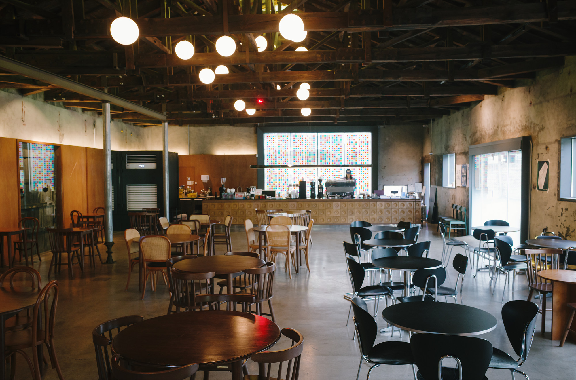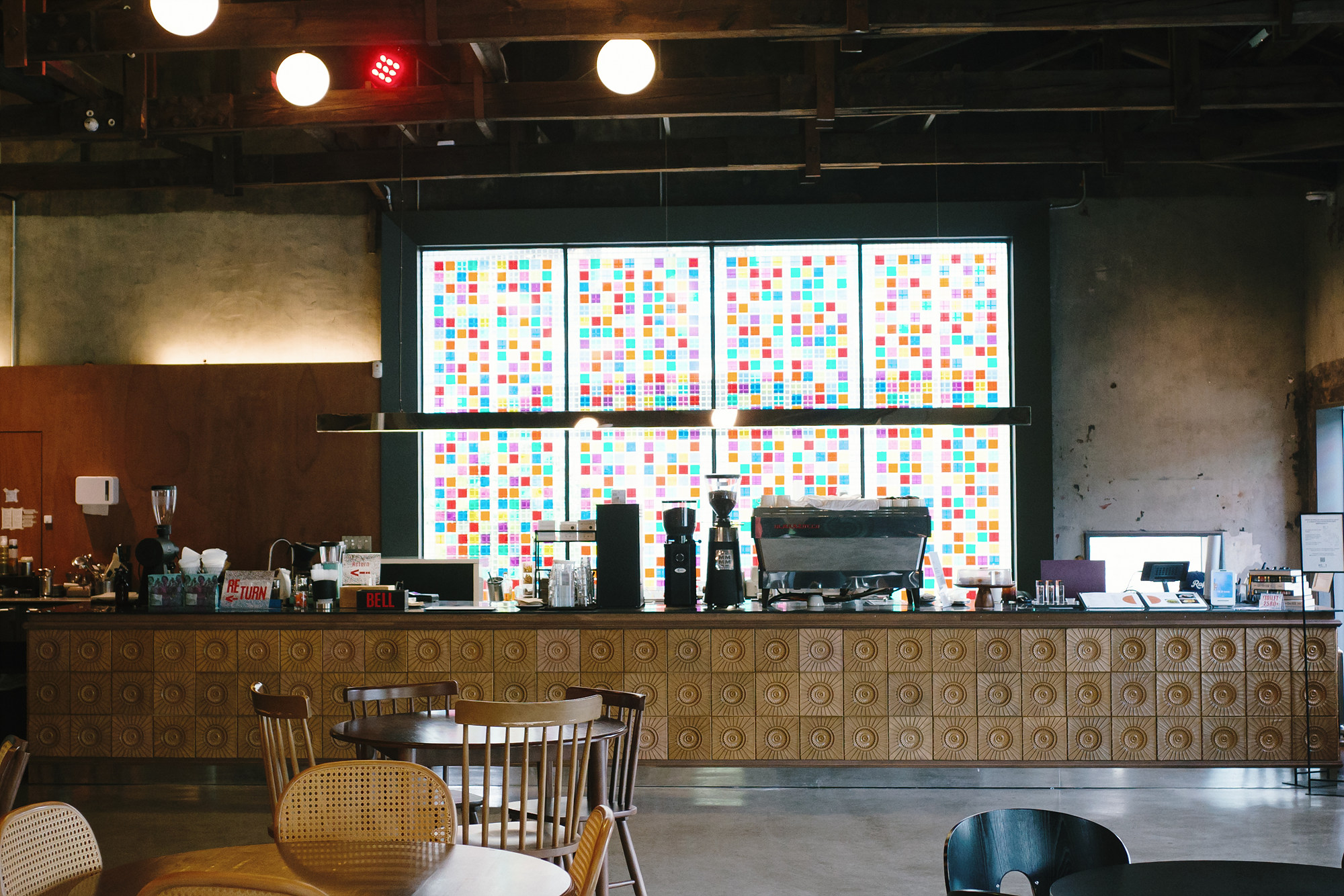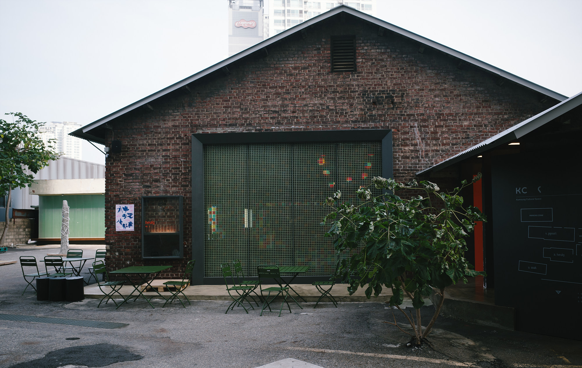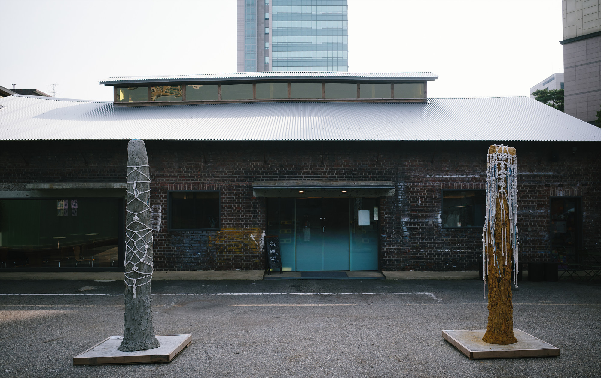 KCS SEOUL에서 함께 운영하는 카페 흙(heulg)은 전시장 바로 옆에 있다. 겉에서 보면 창고를 개조한 듯 투박하지만, 내부는 묵직한 목재 형식의 인테리어와 따뜻한 조명이 중심을 이루고 있다. 높은 층고와 넓게 트인 구조, 그리고 테이블 사이 간격도 넓어서 오랫동안 머물러도 좋은 공간같다. 공간 자체가 여유를 전제하고 있는 듯한 느낌이랄까.