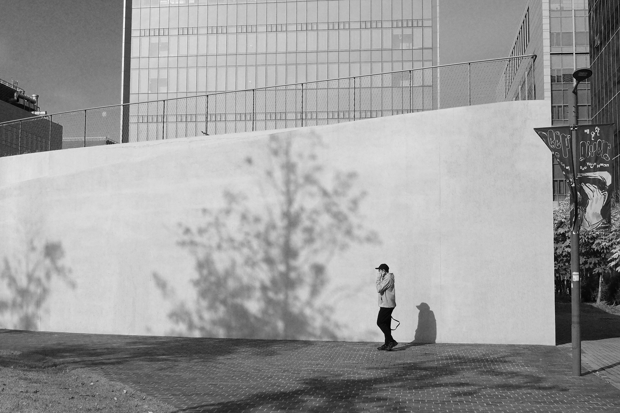 연회색 톤의 반듯한 건물이 하드 모노와 잘 어울릴 것이란 예감이 들어 선택한 장소였고, 그 예감은 틀리지 않았다. 높은 빌딩 사이에 폭 둘러싸인 이곳을 발견한 순간, 사람들이 스페이스 K를 언급할 때 그토록 빛과 그림자를 강조했는지 단번에 이해할 수 있었다. 나무 그림자와 때마침 행인의 그림자가 물감을 찍은 듯 벽을 장식했다. 바로 지금이다! 다행히 카메라를 켜둔 덕에 연회색 벽이 조금 더 다채로워졌다.