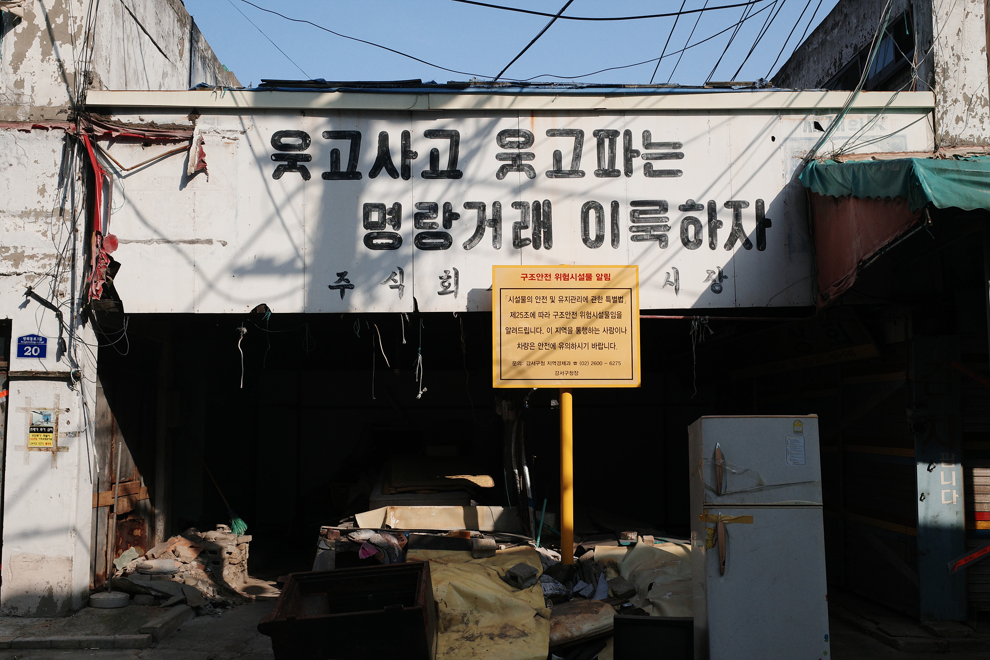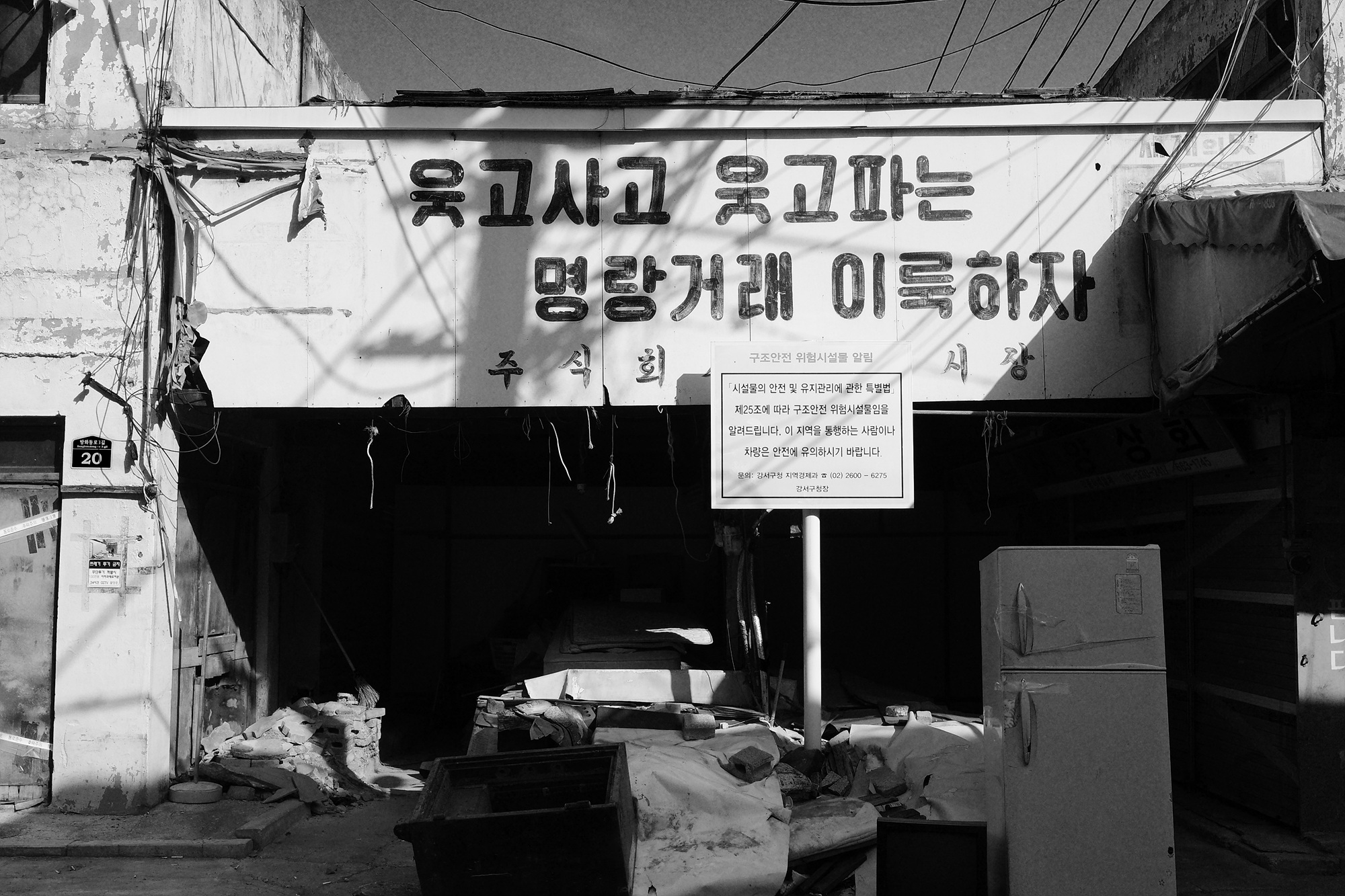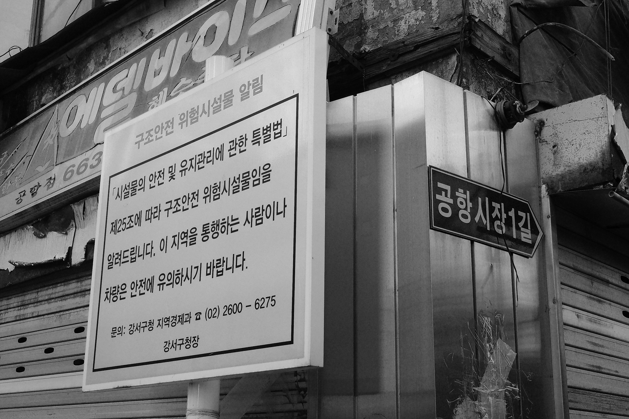 9호선 공항시장역 옆에는 자그마한 공항시장이 있었다. 왜 과거형이냐 하면 재개발 지역이 되면서 사람들이 떠났기 때문이다. 과거의 영광을 뒤로하고 침묵으로 메워진 골목 일대는 조용했다. 건물과 간판과 문은 녹이 슬고, 찢기고, 깨지고, 부서져 있었지만 동시에 수십 년 동안 쌓이고 쌓인 사람들의 흔적이 가득하기도 했다. 얼마 남지 않은 상가의 자그마한 소리를 배경음 삼아 천천히 시간 속으로 들어갔다.