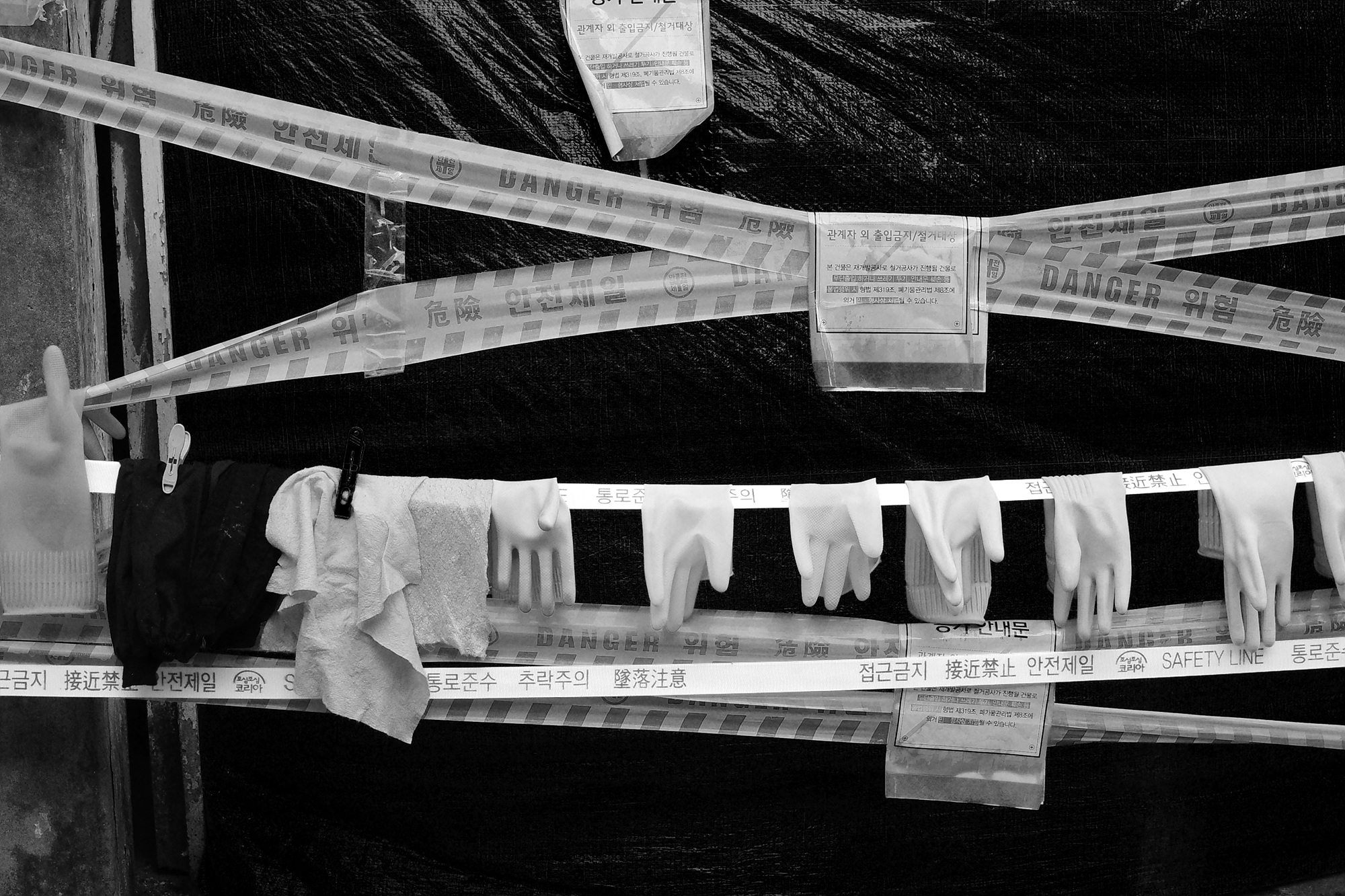 접근 금지 테이프에 널어둔 고무장갑과 수건