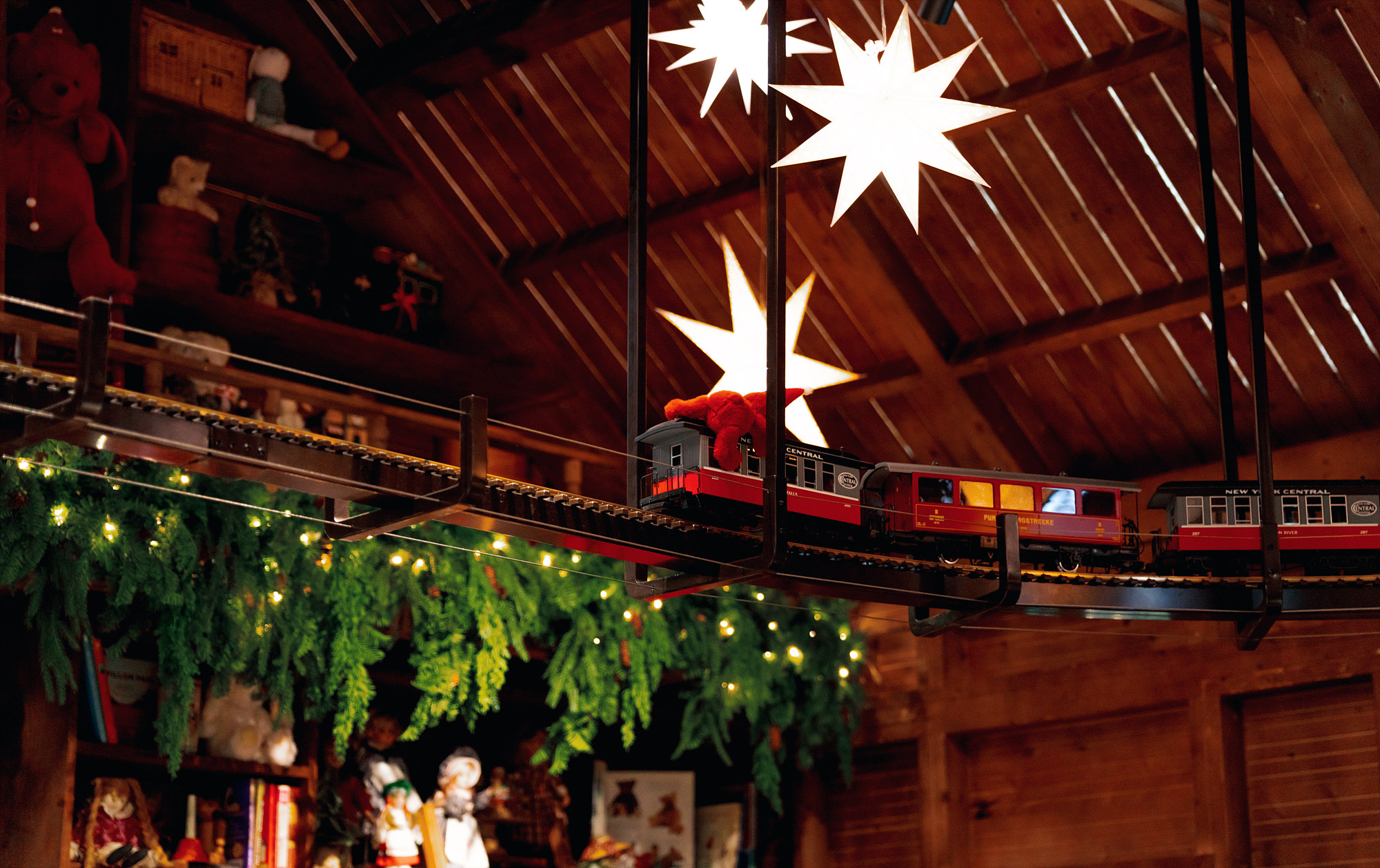 포장 공방입니다. 선물 상자에 물건을 넣고 포장하고 리본으로 매듭을 짓는 해리가 분주해 보여요. 개중엔 농땡이를 부리는 친구도 있고, 지쳐 쓰러진 친구도 있지만 다들 열심히 한 덕인지 선물 상자가 꽤 많이 쌓여 있어요. 미니 자동차, 미니 크리스마스트리, 장난감 등등 빙빙 도는 레일 위엔 아직 포장해야 할 물건들이 많이 있지만요. 가끔 해리도 레일 위를 돌고 있답니다. 바쁜 해리를 지켜보는 다른 동물 친구들도 있었는데 도움이 되는지는 잘 모르겠네요.