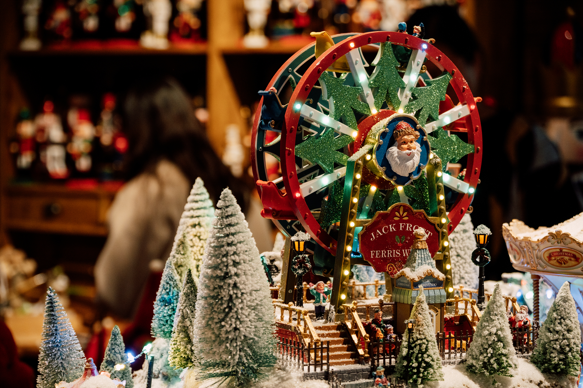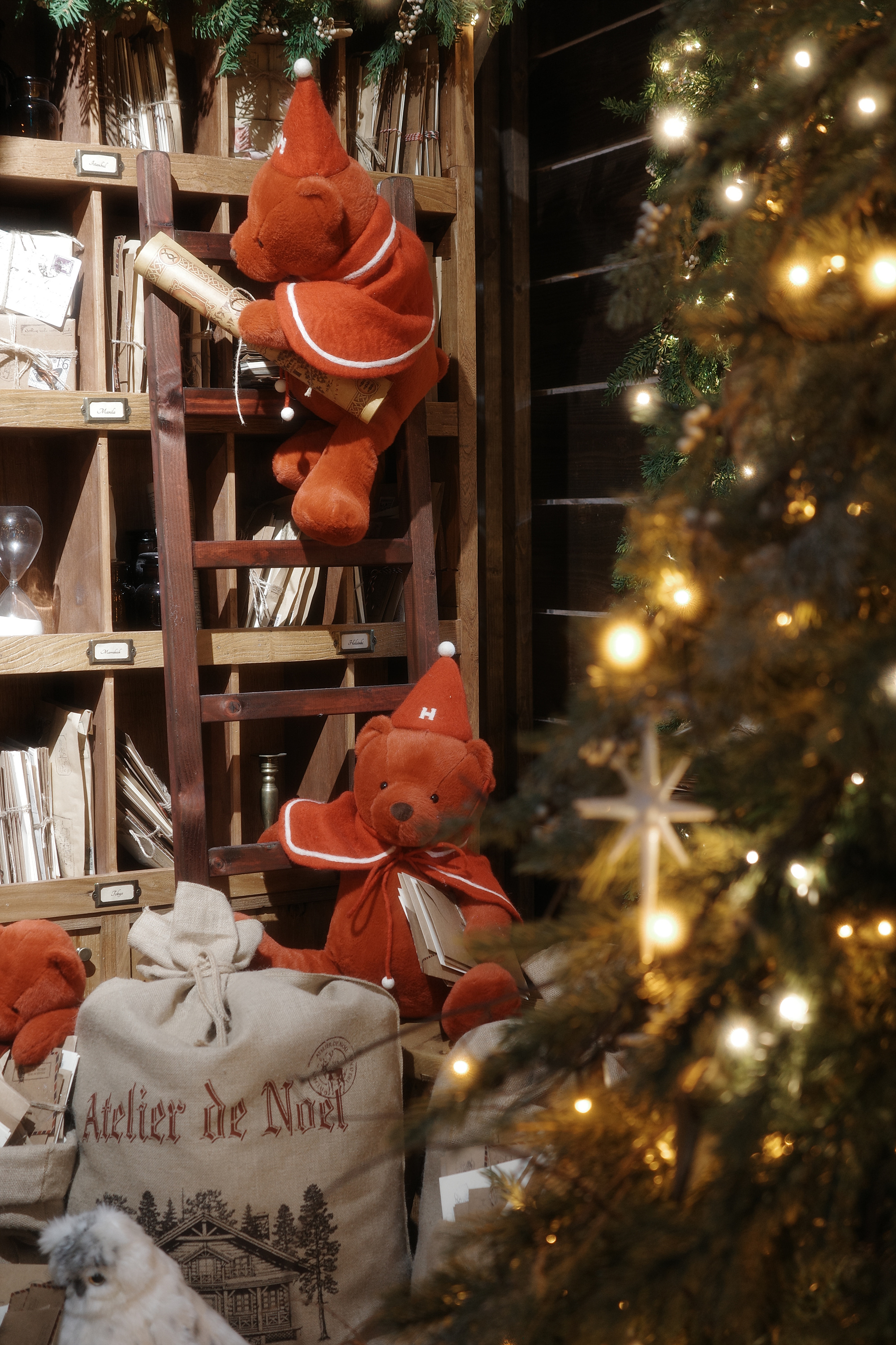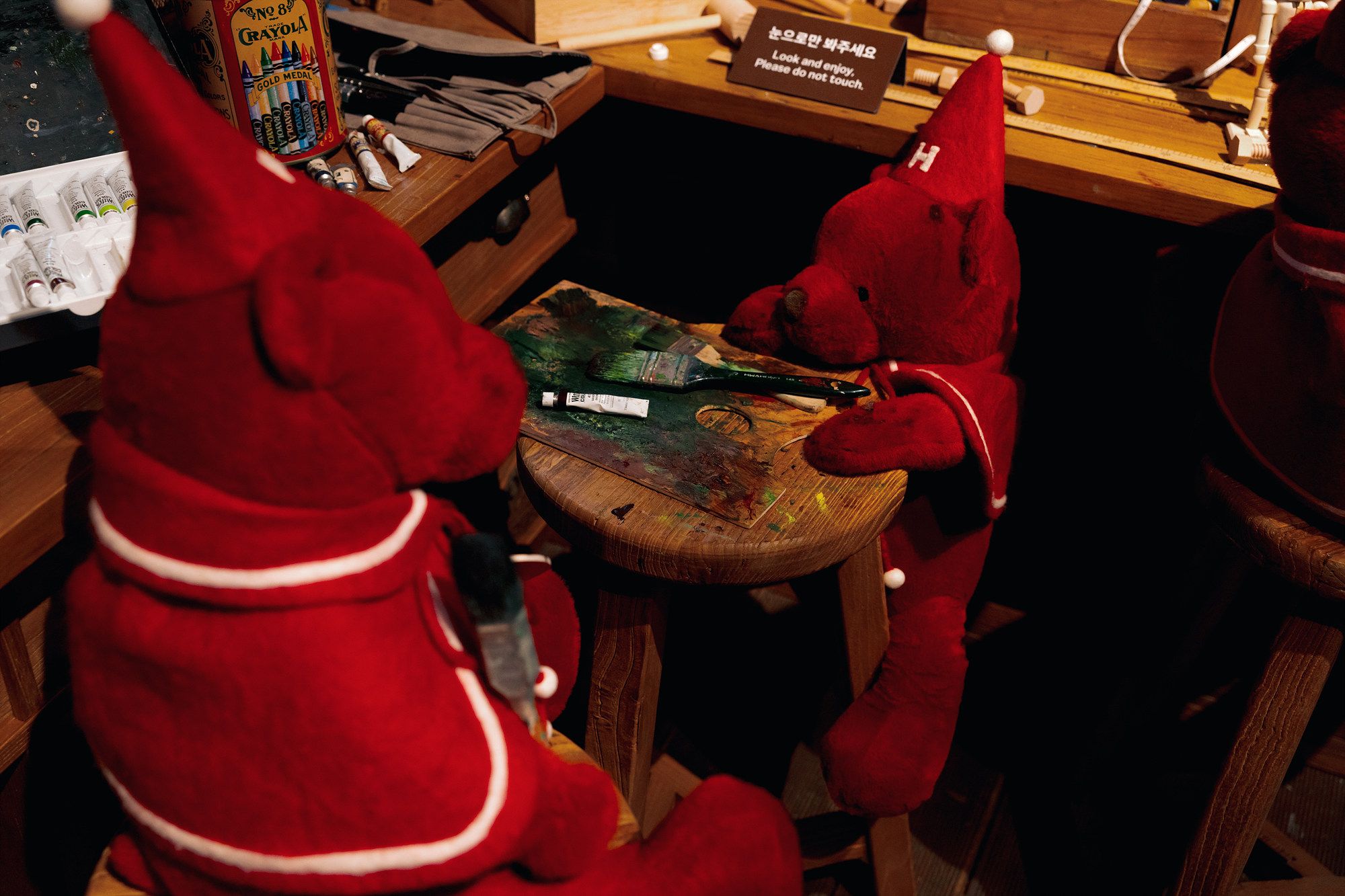마을 여기저기엔 작은 감탄이 나오는 디테일이 있어요. 개인적으로 가장 마음에 들었던 부분이기도 했는데요. 처마 끝에 매달린 투명한 고드름, 눈이 내리는 마을답게 갖춰진 스키와 스케이트, 장작, 떨어진 솔방울 같은 것들이 군데군데 있어요. 마침 숨은 그림 찾기처럼요. 눈이 내린 지붕과 나무는 기본이고요. 또 타탄 체크 담요와 해리가 열심히 작업한 선물 상자도 바깥에서 크리스마스 분위기에 힘을 보태고 있었어요. 움직이는 동물 친구들이나 해리 곰 인형으로도 충분히 꾸밀 수 있는 공간이지만 '공방', '마을', '겨울'이란 콘셉트에 충실한 덕에 작은 공방이 모인 이 마을이 더욱 실감 났어요. 어렵지 않게 발견할 수 있으니 이런 디테일도 한번 찾아보세요. 투 머치 정보지만 저는 고드름을 보고 난 뒤로 다른 디테일 찾기에 잠깐 몰두하기도 했거든요.