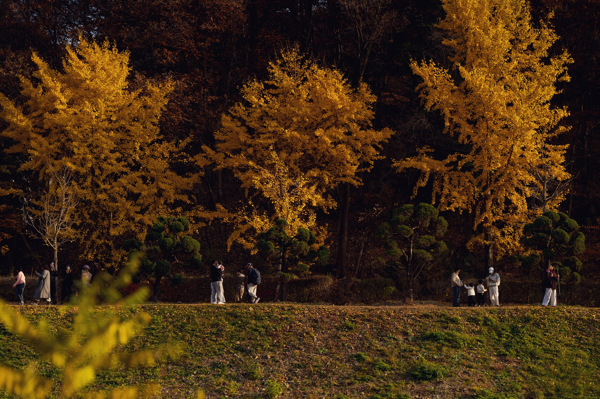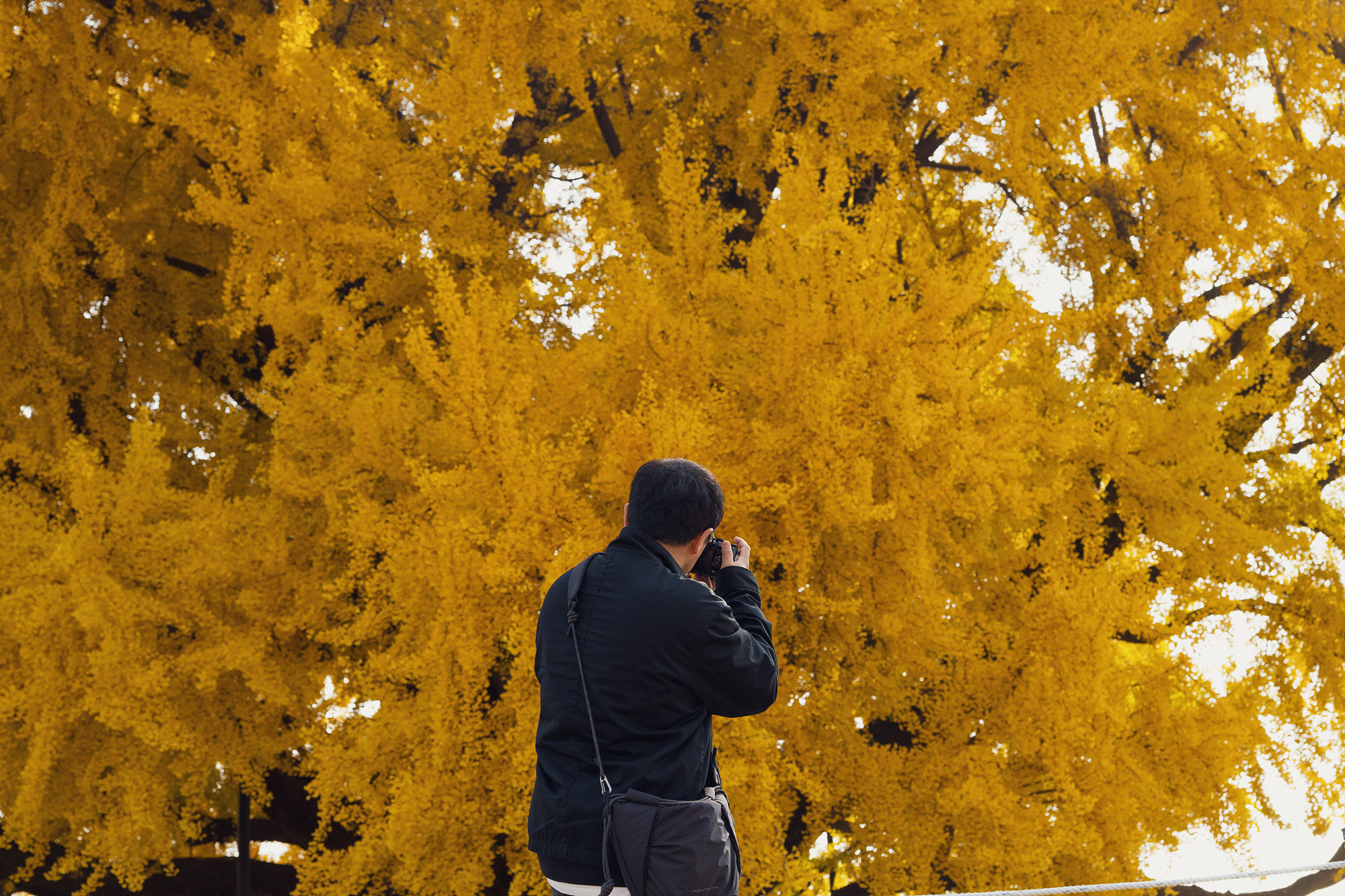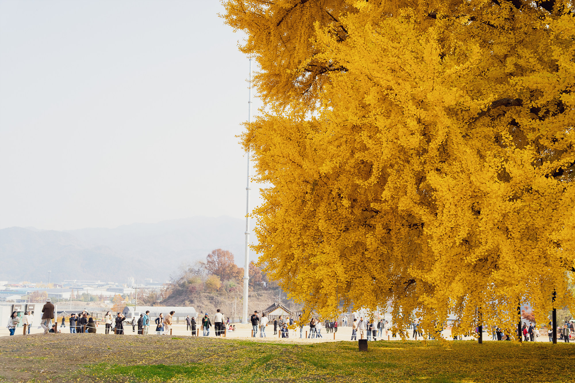 아무래도 은행잎이 노랗게 물드는 고점인 시기라 사진을 찍을 때 주변 사람들이 같이 찍히는 일이 빈번한데요. 조금 거리를 두고 망원렌즈로 촬영해 보니 비교적 나무에 집중해서 촬영할 수 있었습니다. 또 은행나무만 봐도 좋지만 그 뒤로 알록달록 자태를 뽐내는 산과 은행나무가 잘 어우러지니 눈으로 그 광경을 찍어보세요.