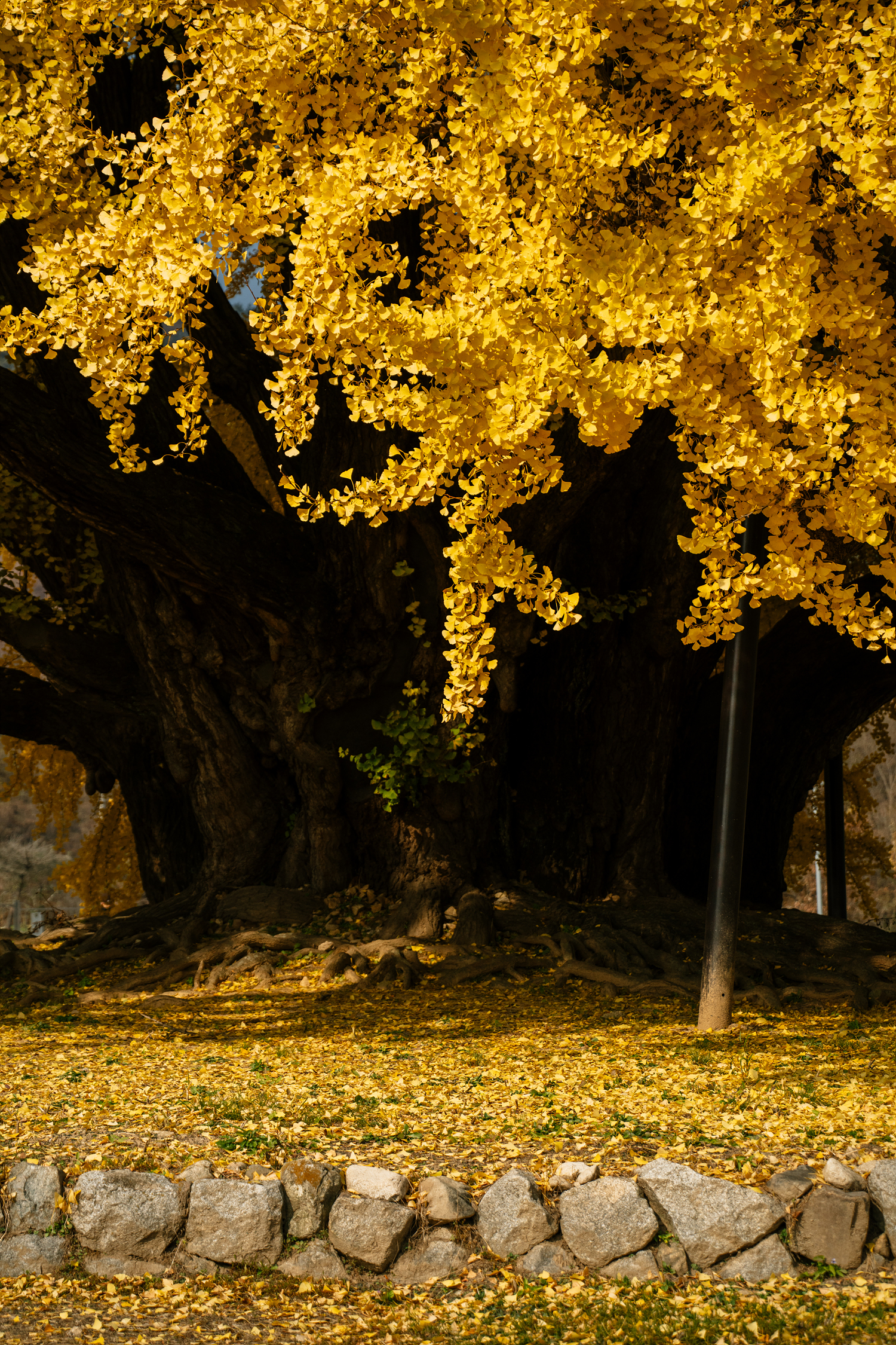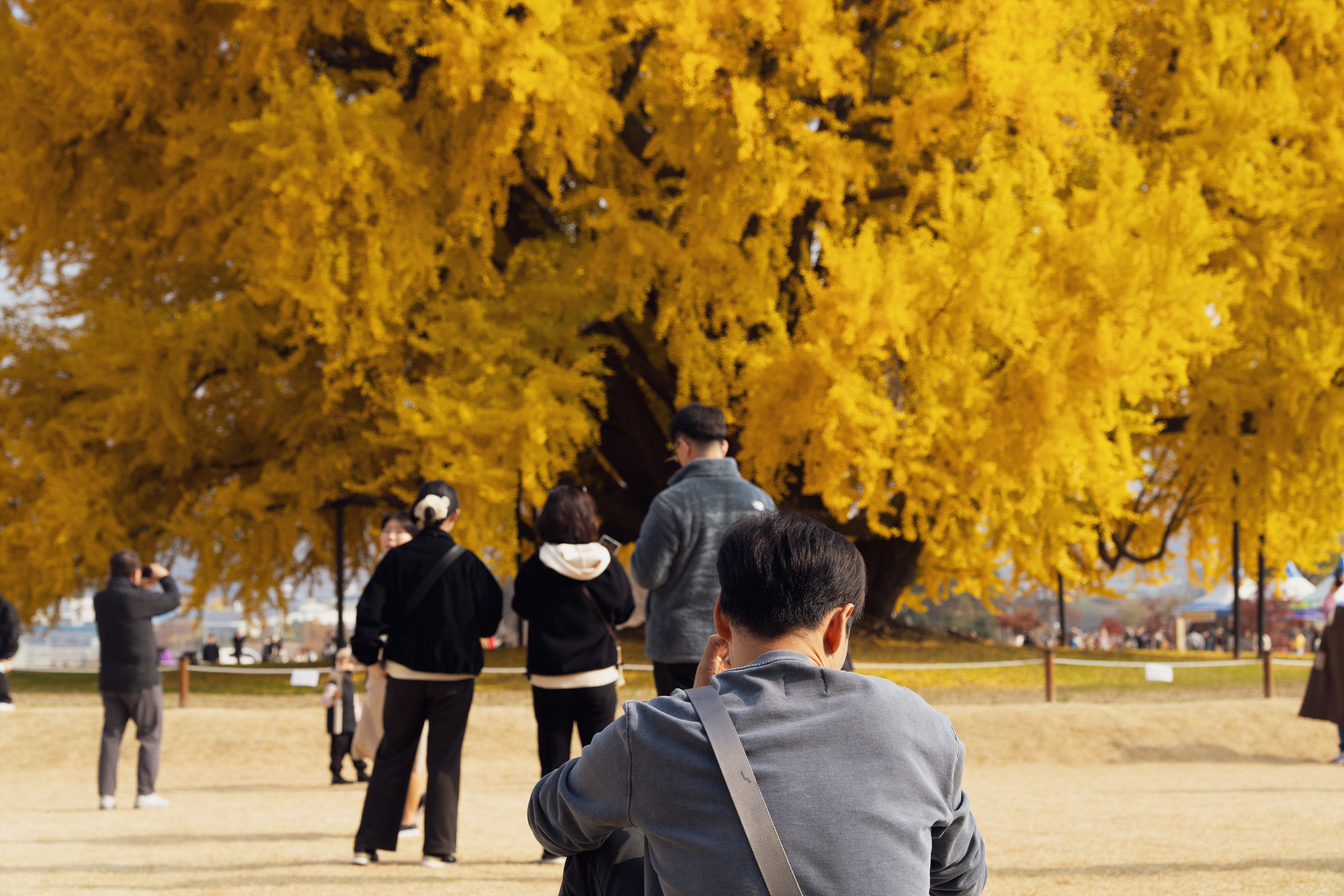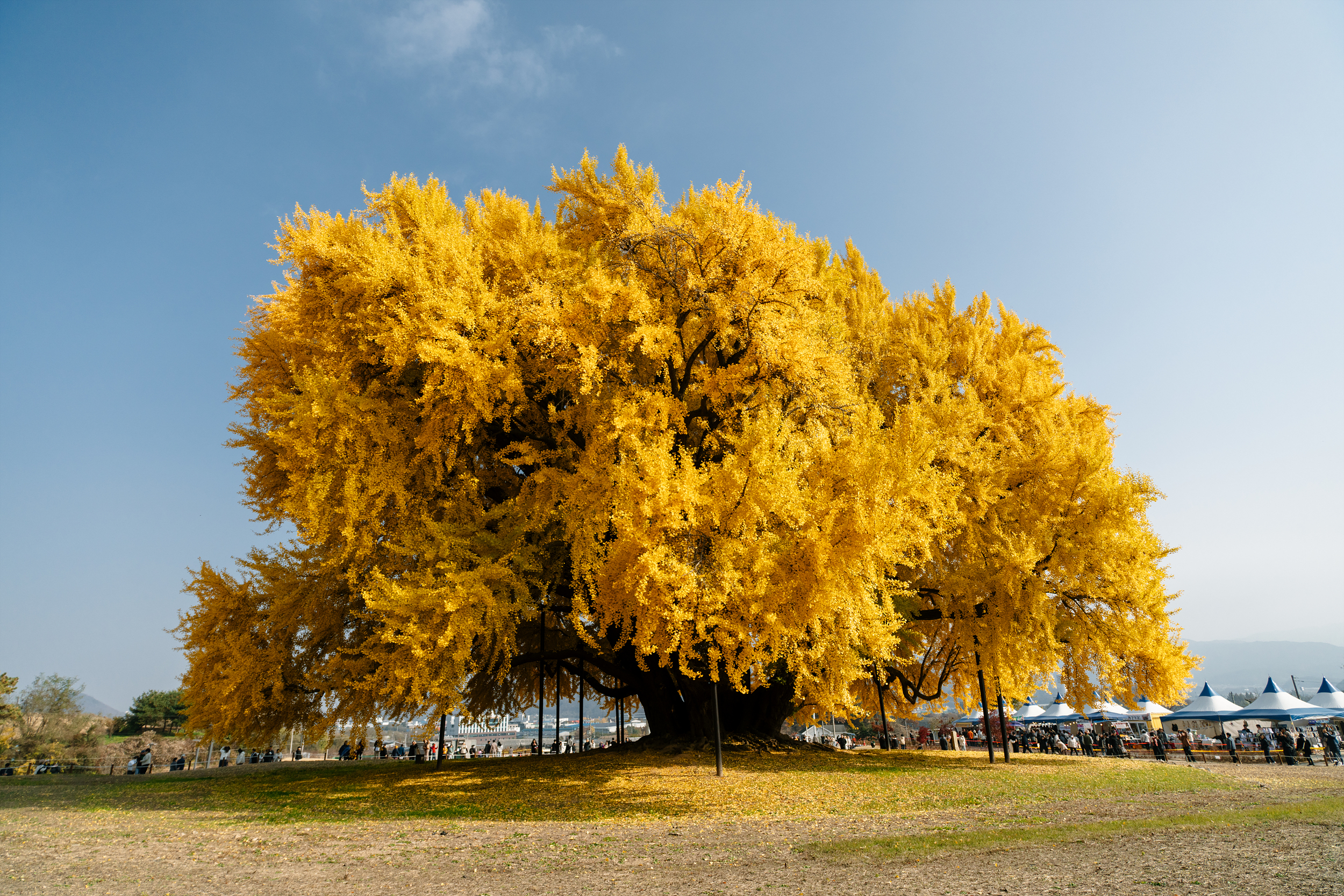 인파를 뚫고 마침내 눈앞에 펼쳐진 건, 사람 열댓 명 정도가 붙어야 다 감싸질 듯한 14m에 이르는 두꺼운 밑동, 그리고 그 위로 수천, 어쩌면 수만 개일 수도 있는 노란 잎들이었습니다. 살면서 나무에 압도될 수 있다는 것을 반계리 은행나무가 처음 알려주었고, 비현실적이어서 옛날이었으면 이 나무를 수호수로 삼았을 수도 있겠다 싶었어요. 입구부터 천천히 나무 주변을 한 바퀴 도는 시간만 해도 10여 분이 걸릴 정도니 그 크기가 얼마나 큰지 대충 감이 오실 거예요. 10여 분 동안 한 바퀴를 돌았는데도 여전히 처음 봤을 때 그 신기하고 놀랍단 생각이 떠나질 않을 정도로요. 걷다 보면 여기저기서 보기만 해도 좋다는 감탄도 들려오는데, 십분 동감할 만큼 이 나무가 주는 기운이 남달랐어요.