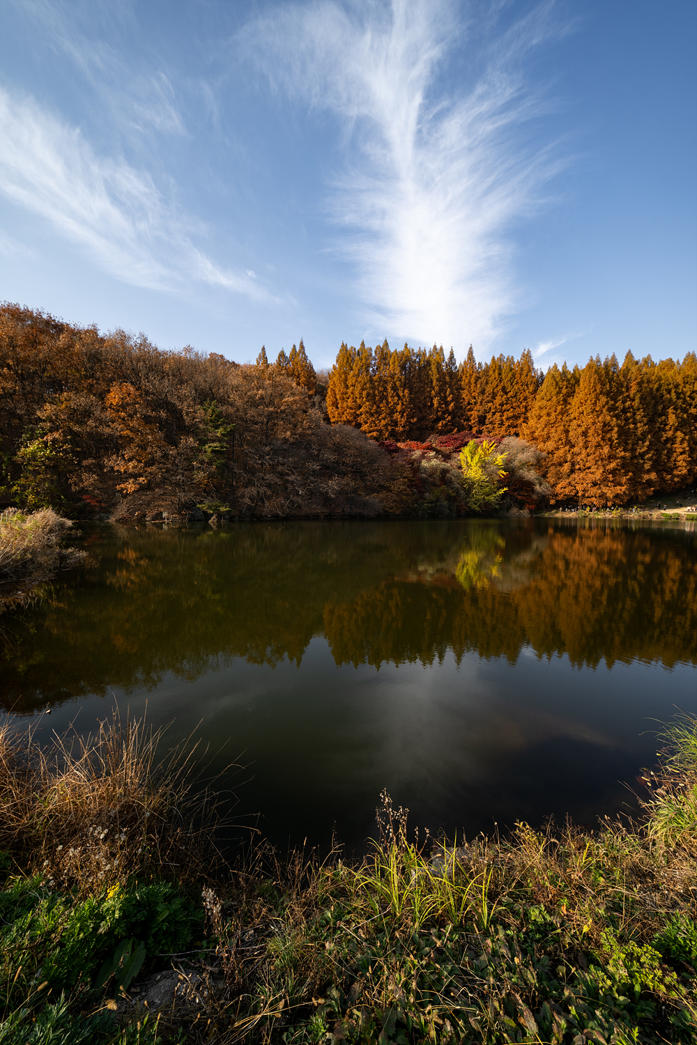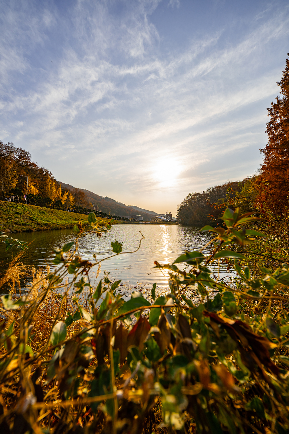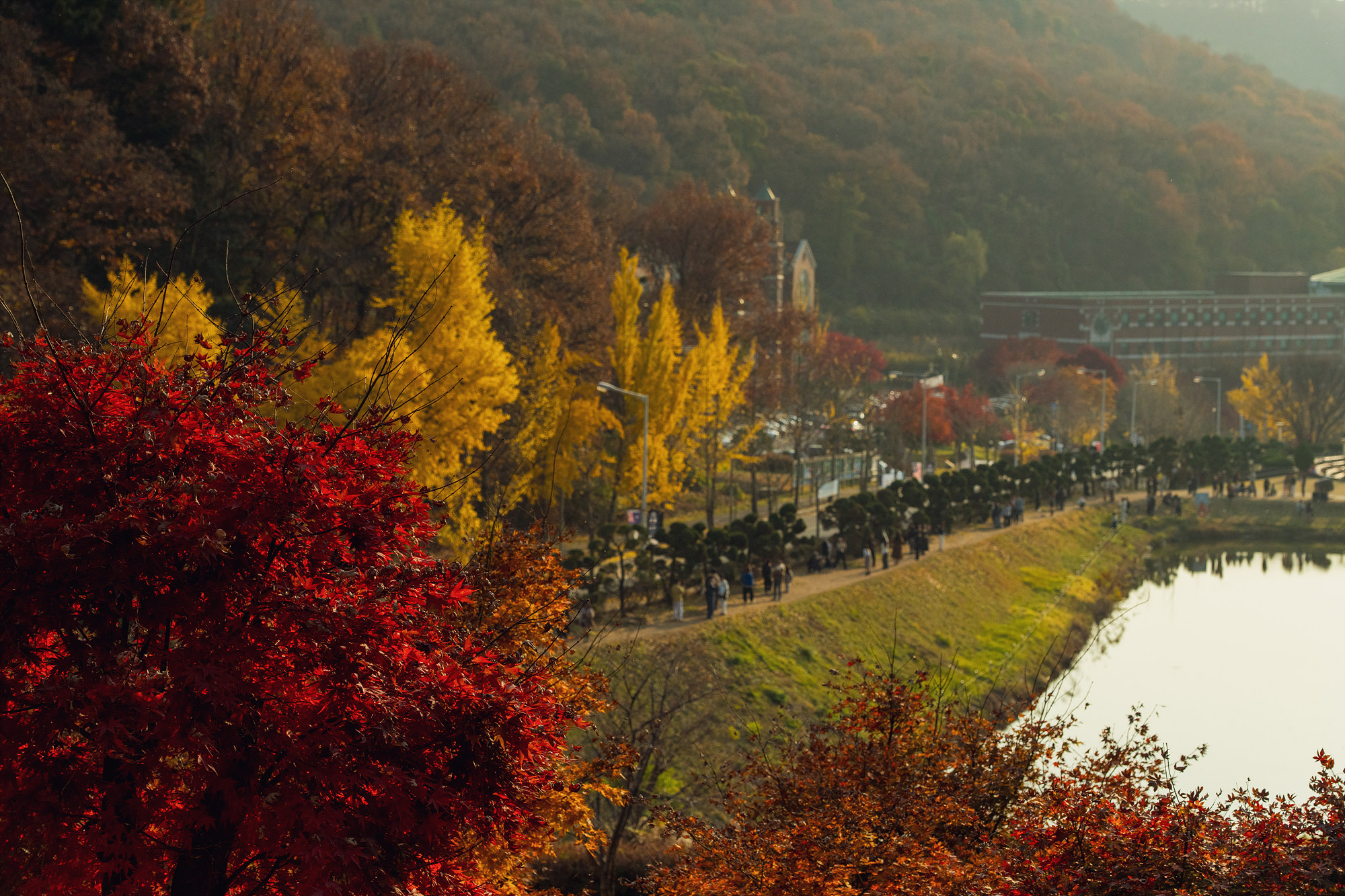 학교 정문부터 아주 빨갛게 물이 든 단풍나무와 바람에 나부껴 노란 눈처럼 떨어지는 은행잎이 시선을 사로잡아 완연한 가을이 맞긴 하구나 싶었는데, 명수당에 발을 들이자 가을의 모든 것이 여기에 있었어요. 단풍나무는 물론, 낙엽수인 메타세쿼이아가 초록빛, 노란빛, 갈색빛 등 다양한 색채를 입은 채 곧게 서 있있어요. 그리고 그 모습이 저수지에 반영돼 잔잔하게 일렁이는 장면이 정말 아름다웠습니다. 눈앞에 펼쳐진 풍경뿐만 아니라 저수지에 반영된 장면을 꼭 담아보는 걸 추천.