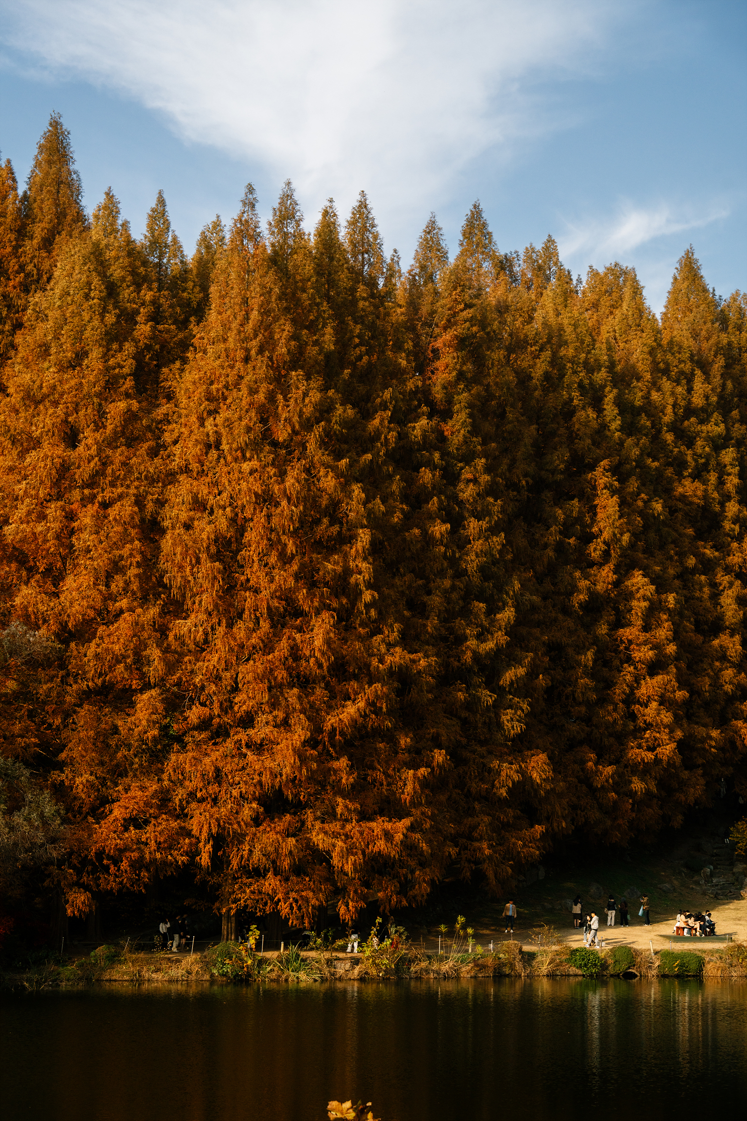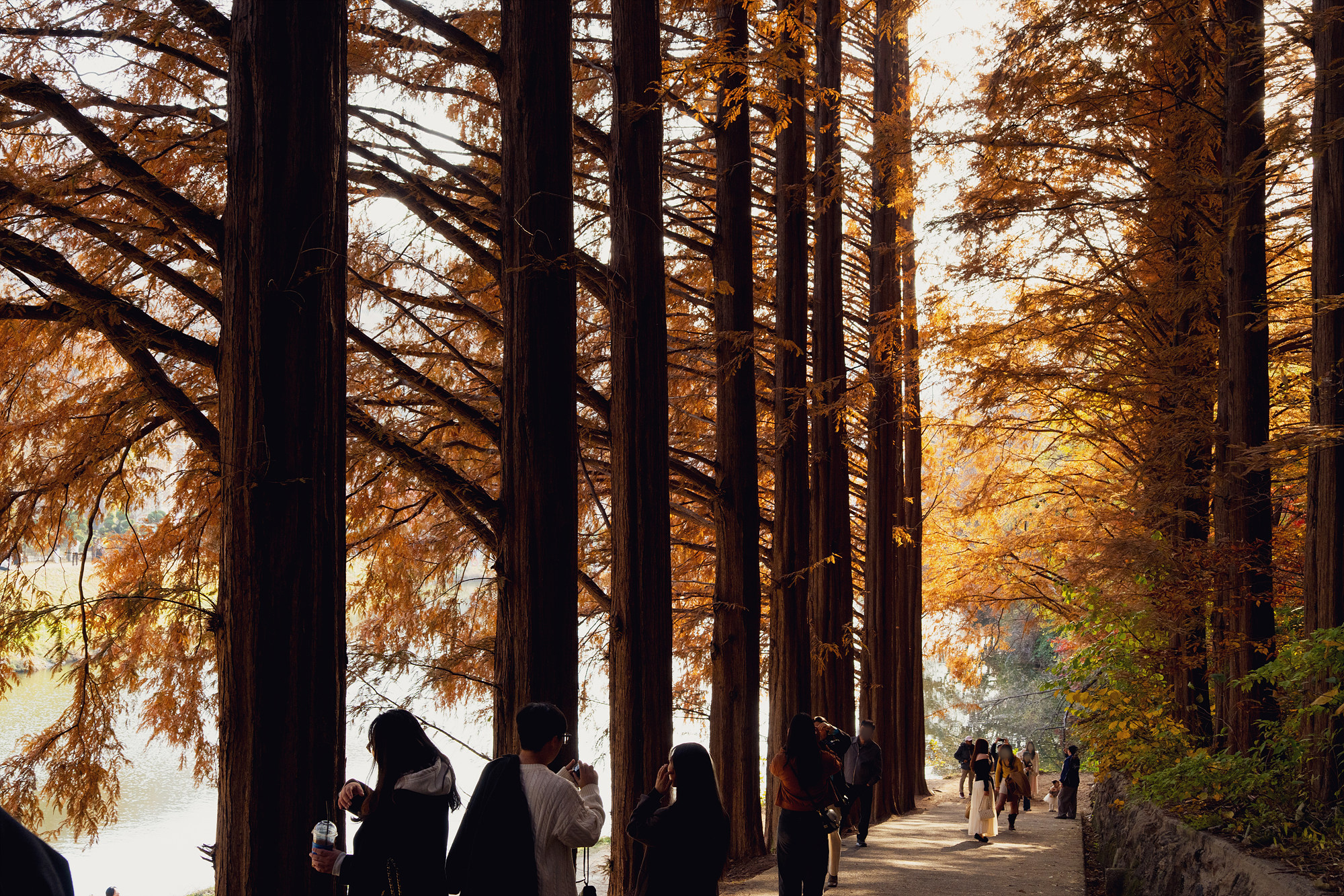 이 반영이 첫 번째 포인트라면 두 번째 포인트는 메타세쿼이아 길입니다. 일정한 간격으로 식재된 메타세쿼이아는 멀리서 봐도 멋지지만 그 품으로 들어가면 아늑하고 선선해요. 커다란 나무가 그늘을 만들어 가벼운 산책을 하기에 좋고 가끔 나무 사이사이로 빛이 스며드는 광경도 예술입니다. 메타세쿼이아를 한번에 담을 수 있는 명수당 초반 지점과 메타세쿼이아 길에 사람이 오밀조밀 모여 있는 건 다 이유가 있었던 거죠.