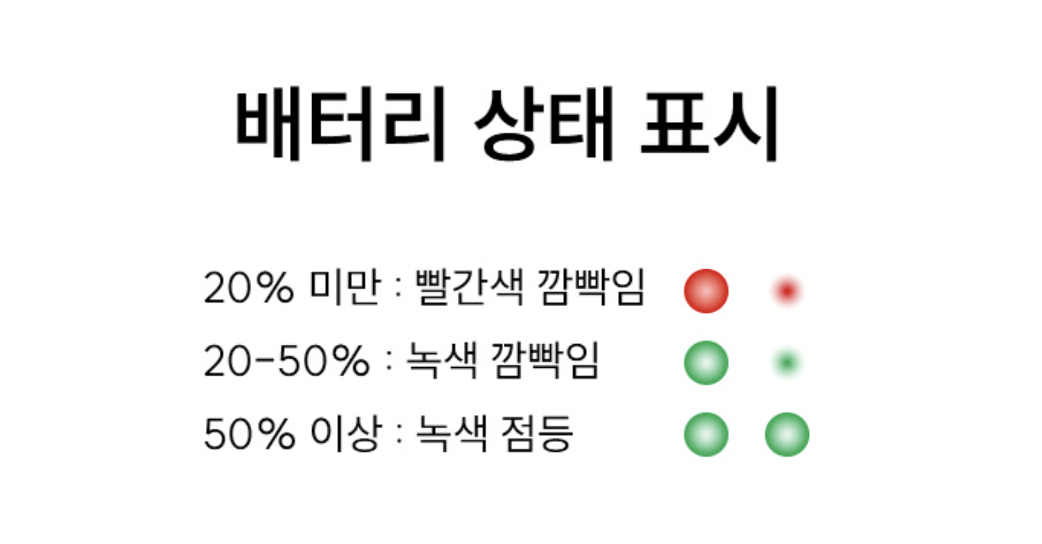 | 사용 시간 | 100% 밝기 시 약 1시간 정도, 25% 밝기 시 약 5시간 30분 정도 |