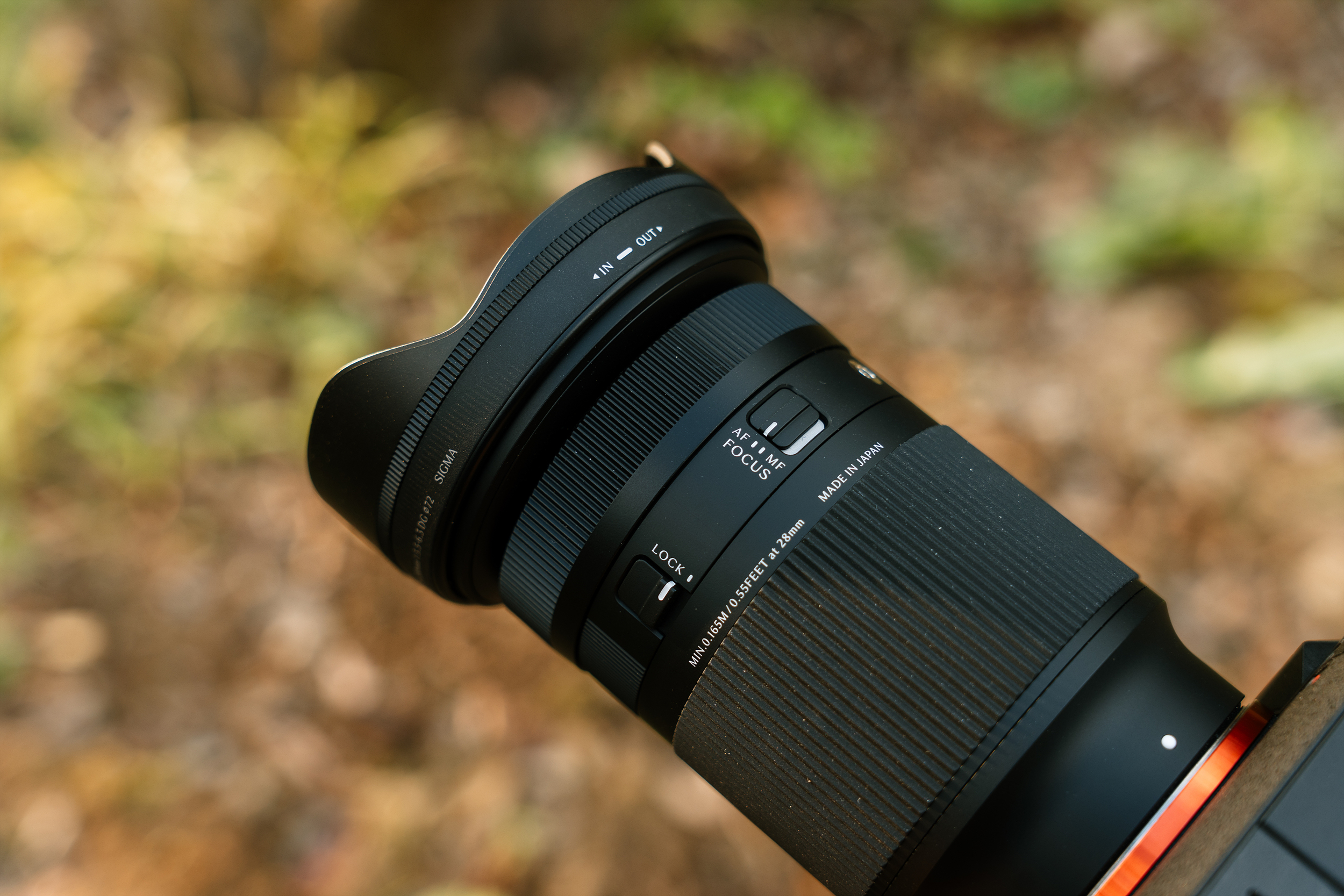 렌즈는 언뜻 보기에는 APS-C 전용 렌즈와 별 차이가 없어 보이는 작은 크기에 심플 합니다. 줌 링이 렌즈의 반 이상을 차지하고 있어서 어떤 상황에서도 조작이 쉽고, 렌즈 측면 버튼도 AF/MF 포커스 설정 레버와 렌즈가 흘러내리는 것을 막아줄 LOCK 레버가 끝입니다. 시그마는 철저하게 소형, 경량 설계를 바탕으로 언제 어디서든 빠르고 간편하게 다양한 촬영이 가능한 렌즈로 기획했다고 밝힌 바 있습니다. 그렇기에 목적에 맞지 않은 기능과 설계 등은 과감하게 빼버렸습니다. 단호한 의지가 엿보이죠.