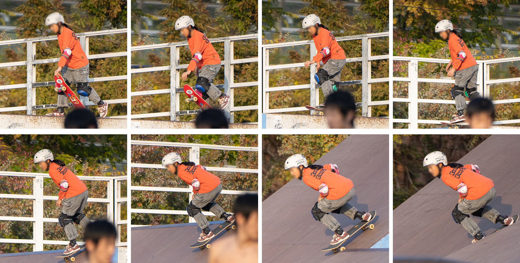 그다음 스케이트보드를 타는 사람의 경우, 얼굴의 윤곽, 헬멧에 쓰인 글자, 나이키 로고, 티셔츠 백 프린트가 모두 선명하게 찍혔을 때 초점이 맞았다고 판단했다. 그 결과 8장의 사진 모두 초점이 맞은 것을 확인할 수 있었다.