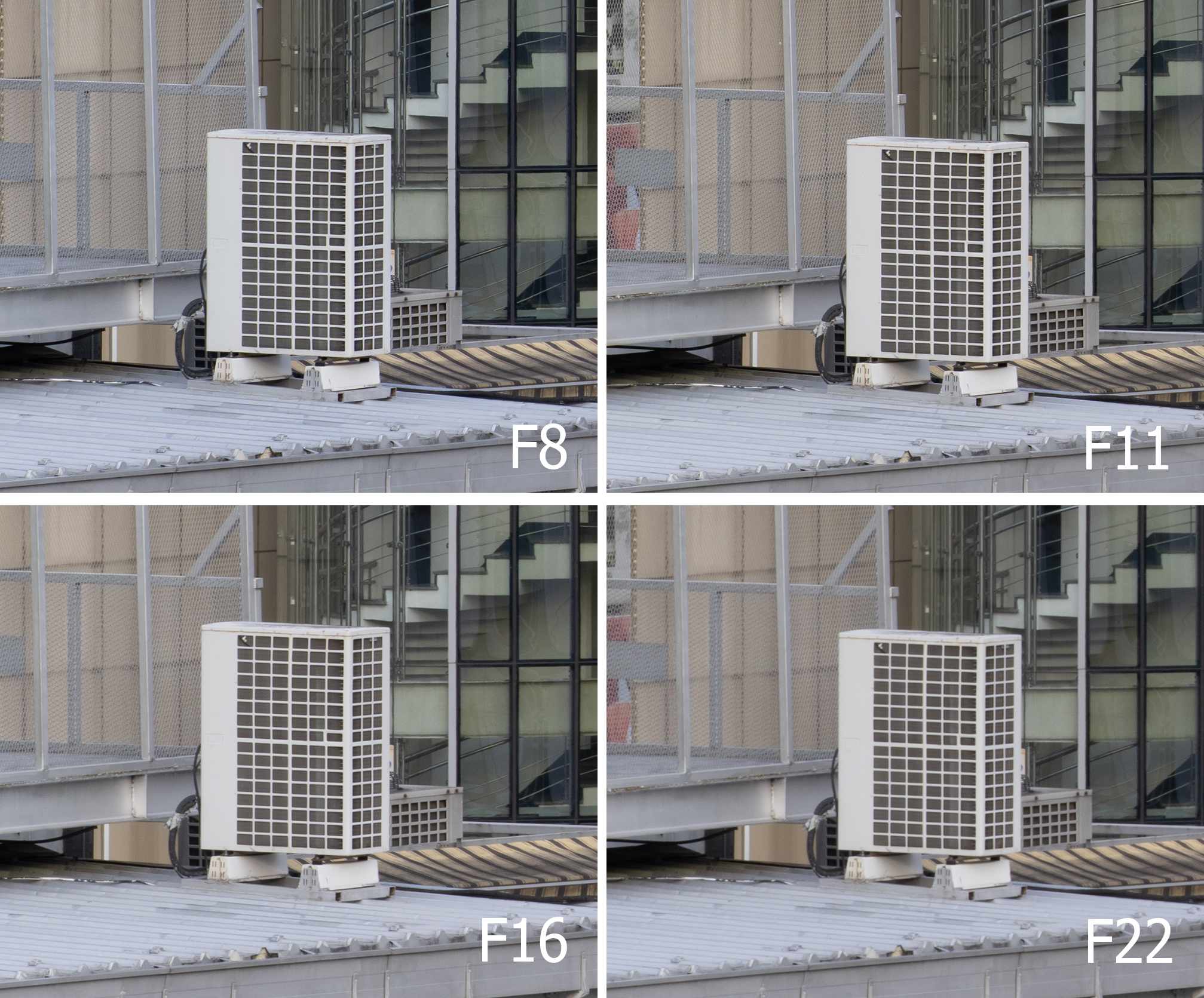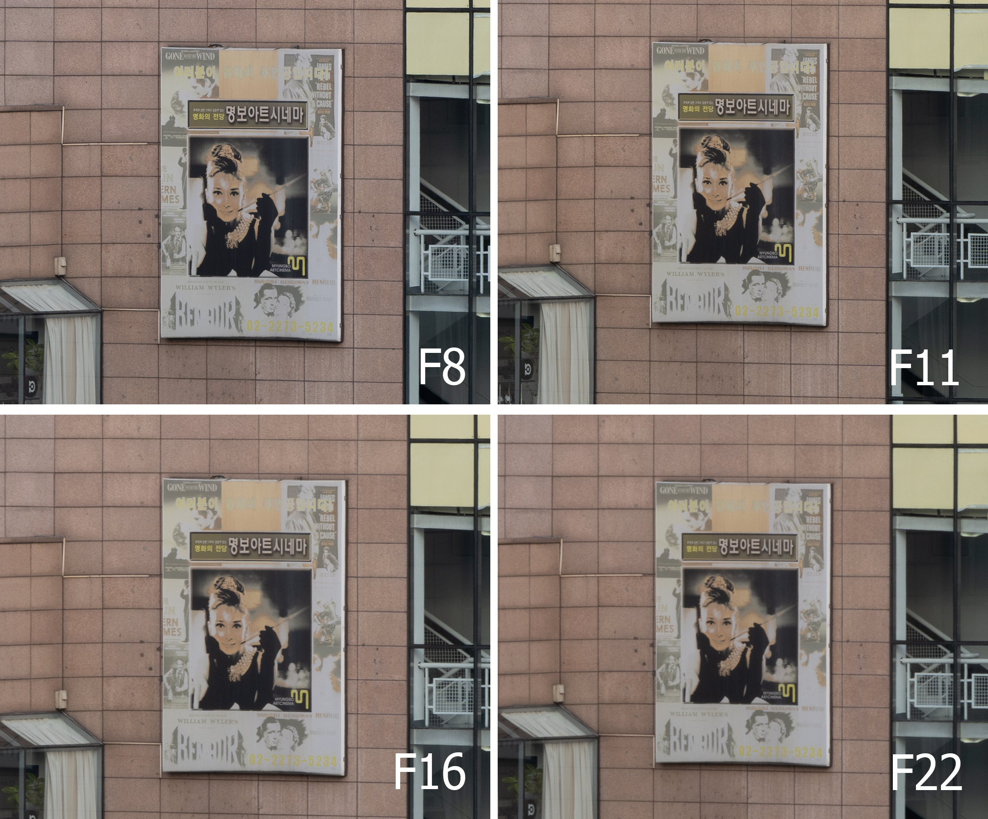 주변부 해상력 역시 중앙부와 비슷한 패턴을 보인다. F2–2.8 구간에서는 중앙부에 비해 해상력이 떨어지지만, F4부터 주변부 해상력이 확 살아나면서 F8에서 정점을 찍고 F11까지 최고 수준의 해상력을 자랑한다. F16부터 22까지 중앙부와 마찬가지로 회절로 인한 해상력 저하가 눈에 보이기 시작한다.