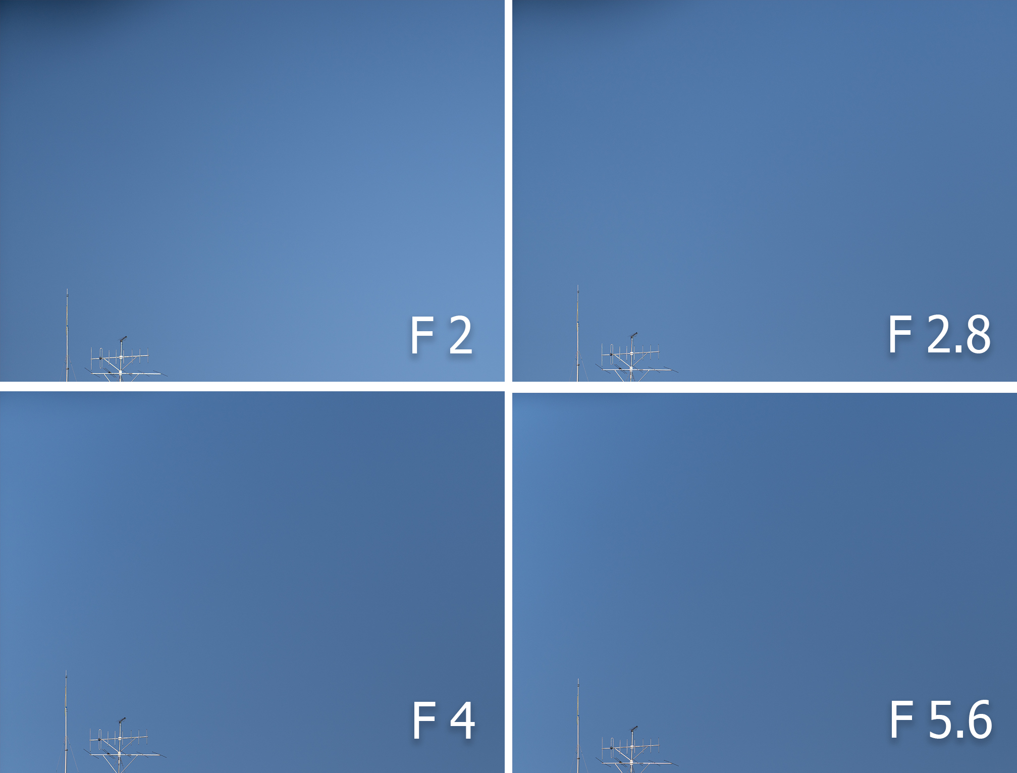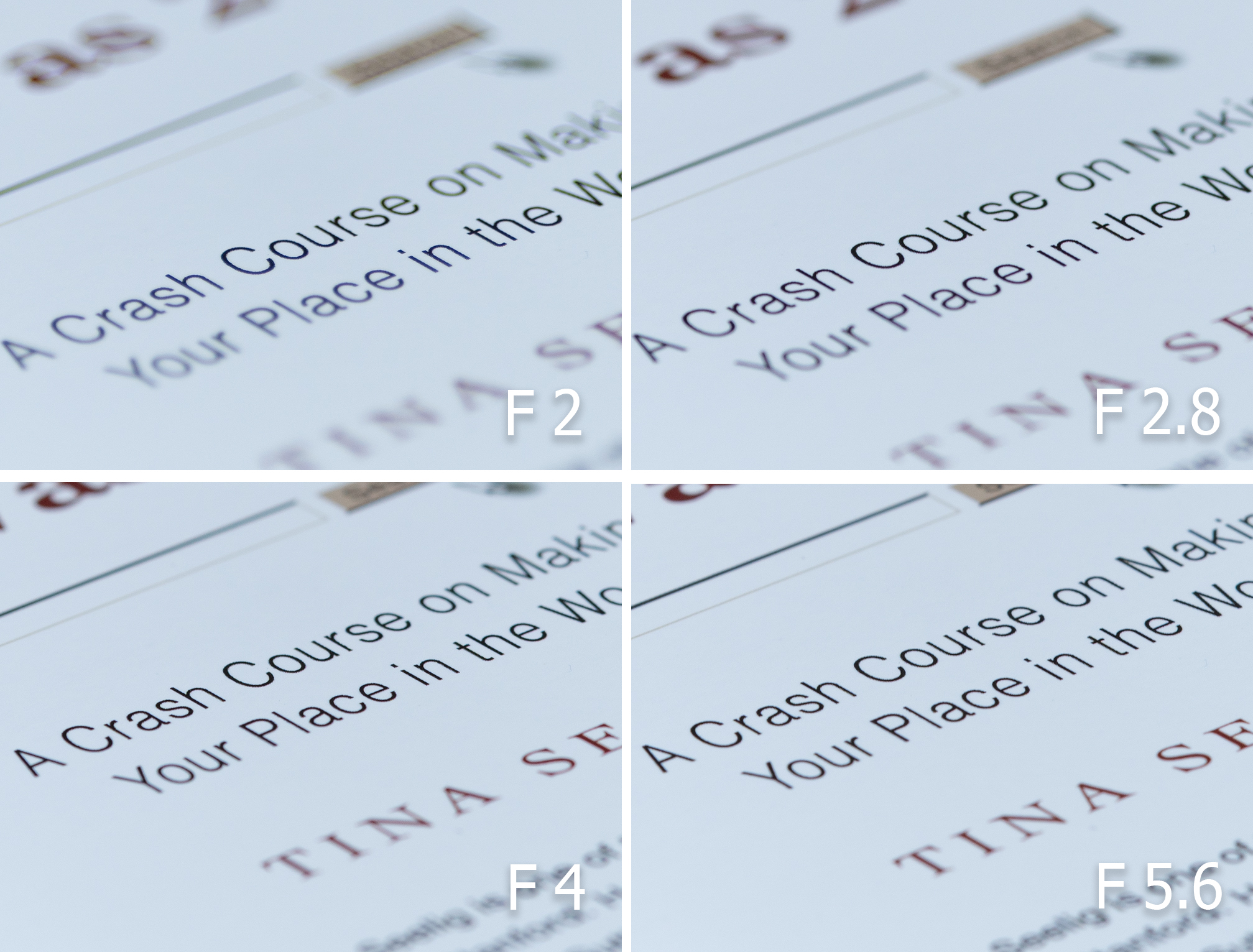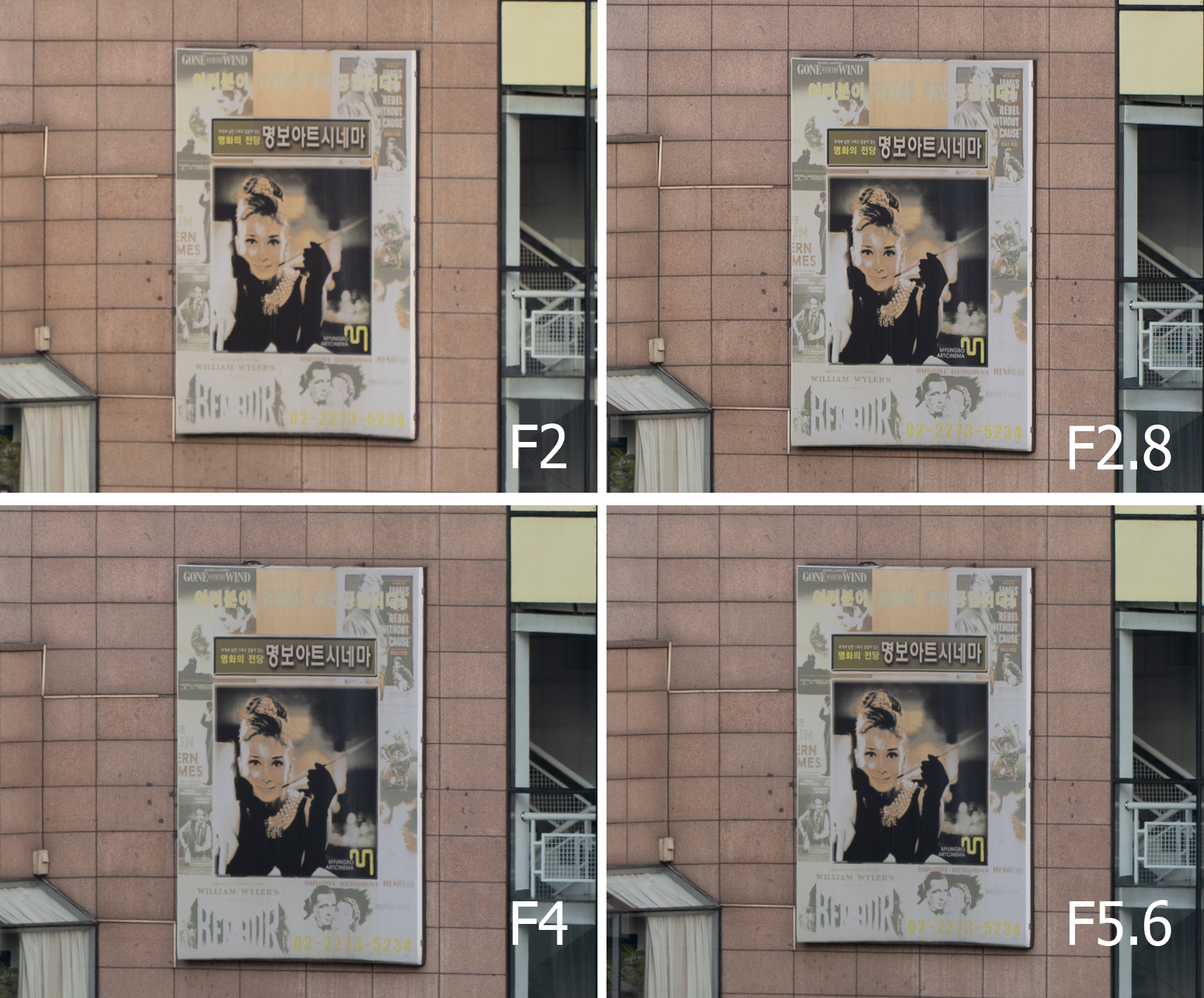 초점 거리 200mm와 f/2 대구경 조리개는 강한 압축감과 배경 분리 그리고 강렬하고 풍성한 보케를 만들어 내는 동시에 색수차와 비네팅이라는 골치 아픈 숙제를 떠넘기기도 한다. 먼저, 장망원 렌즈와 대구경 조리개의 최대 약점인 축상 색수차부터 확인해 보자. 최대 개방 f2에서 초점이 맞은 글자 앞뒤로 보라/파란/노란색 테두리를 확인할 수 있었다. 하지만 f2.8에서는 약 80% 이상 사라져 희미한 색수차만이 간신히 확인되었고, f4부터는 색수차가 전혀 보이지 않기 시작했다.
