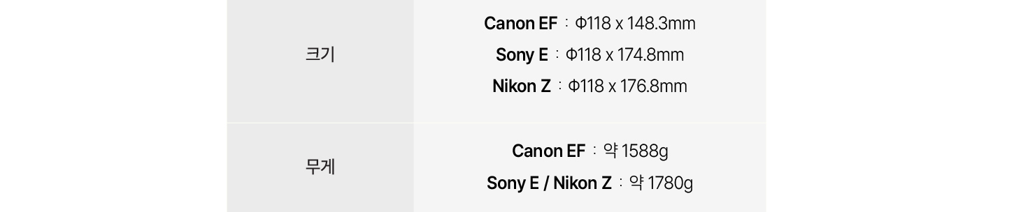 무게와 크기는 마운트 별로 약간씩 차이를 보인다. 아래 표를 보면 크기와 무게는 EF 마운트가 가장 작고 가벼우며, EF 마운트와 Z 마운트는 둘 다 무게는 같지만 EF 마운트가 약간 더 작은 것을 알 수 있다. 처음 이 렌즈를 마주한 순간, 생각보다 작은 크기가 가장 먼저 눈길을 끌었다. 내가 알던 대포 카메라가 아닌데? 우리가 흔히 알고 있는 아이돌 직캠을 찍는 대포 카메라로 많이 알려진 화각대가 바로 200mm이기에 생각보다 짧고 작은 크기는 눈길이 갈 수밖에 없었다. 작은 크기 덕에 약 1,588g(EF 마운트)이라는 무게는 가볍게 느껴졌다. DSLR 200mm 렌즈의 절반 정도 무게를 자랑하니 말이다.