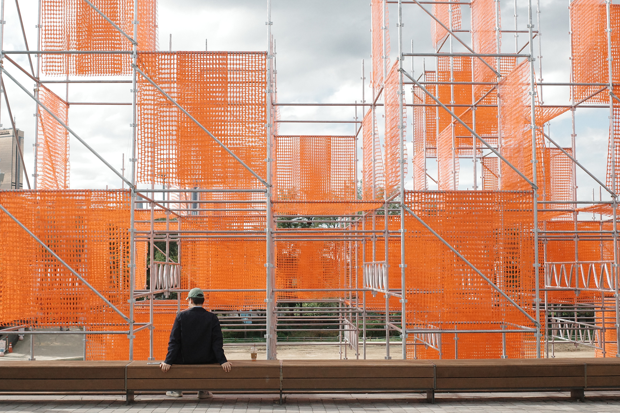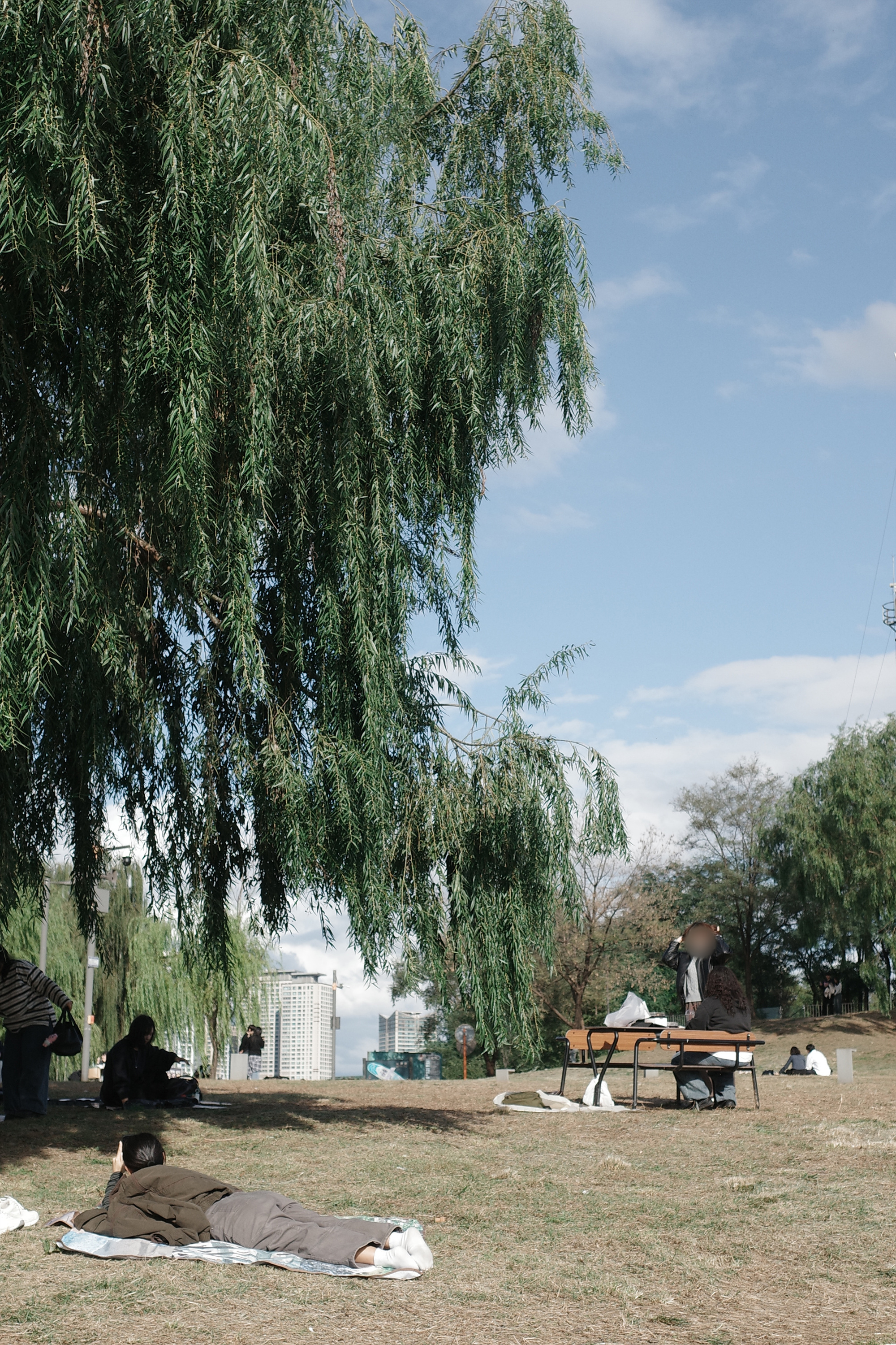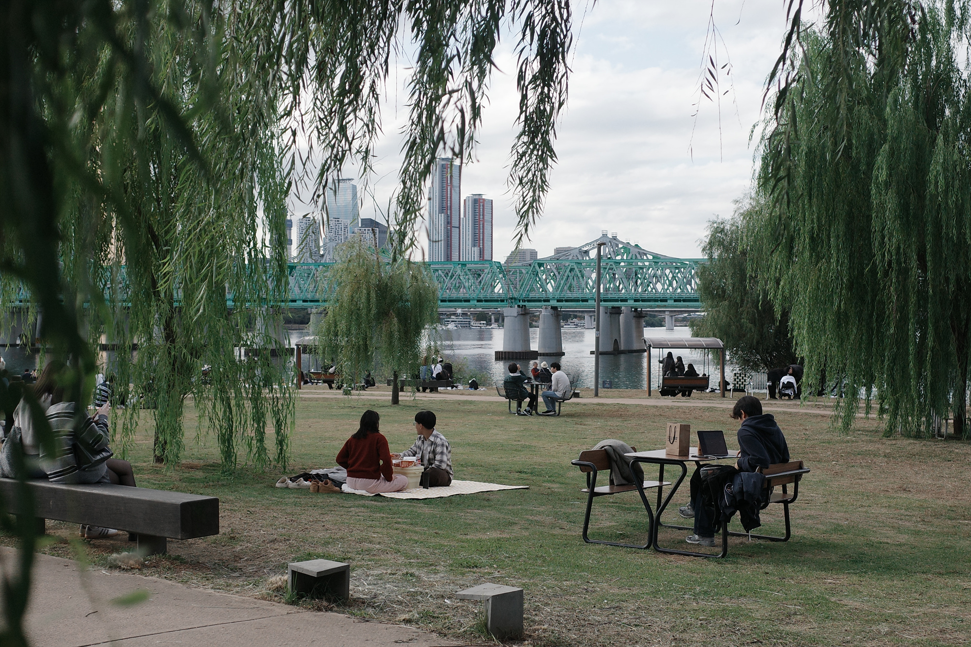 아침은 그야말로 하늘이 푸르렀고 구름이 풍선처럼 뭉게뭉게 떠 있는 쾌청한 가을 날씨였다. 그랬건만 오후가 되자 잔뜩 낀 회색 구름 사이로 하늘이 살짝 보이는 그런 날씨로 바뀌었다. 아쉽지 않다는 건 거짓말이지만 한편으론 이런 날에 네거티브 모드로 촬영하면 어떤 장면이 만들어질지 궁금했다. 평일 오후에도 노들섬은 사람들로 북적였고 한강 철교 위로 달리는 지하철 소리는 자연스럽게 사람들 대화 소리에 섞여 들었다. 사람들은 돗자리를 깔고 누워 있거나, 물멍을 하거나, 사진을 찍거나, 음식을 먹으며 저마다의 시간을 보내고 있었다.