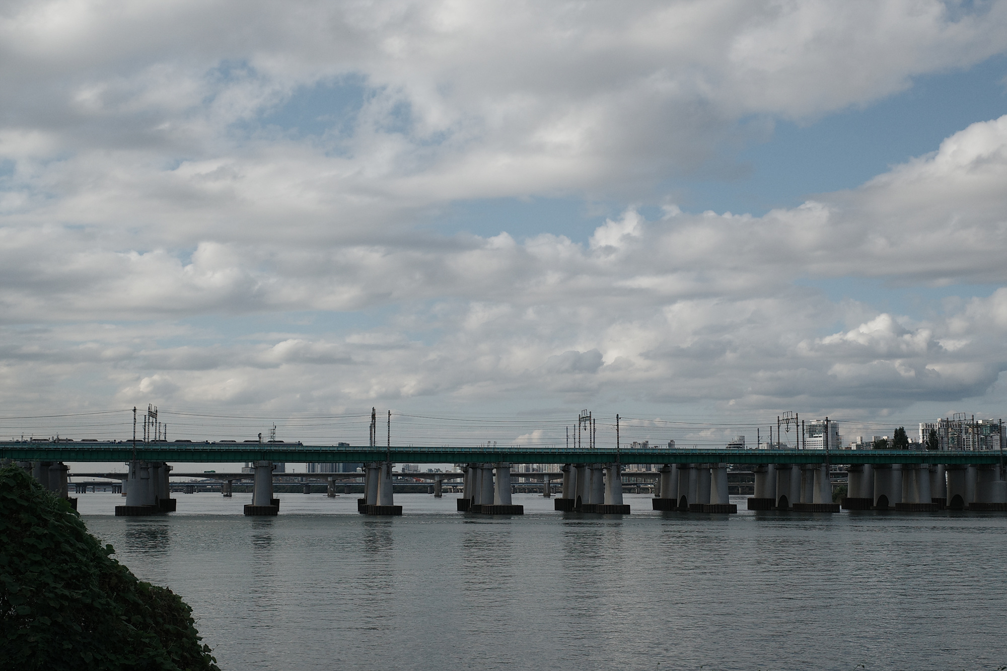 사진에서 볼 수 있듯 진녹색인 한강철교는 청녹색으로 톤이 낮아진다. 해가 들지 않아 오히려 선명한 네거티브의 색을 확인할 수 있는 순간이었다. 또한 두껍게 모인 구름 사이로 드러난 하늘은 실제로 보면 꽤 파랬으나 네거티브로 본 하늘은 그야말로 '하늘색'이었다.