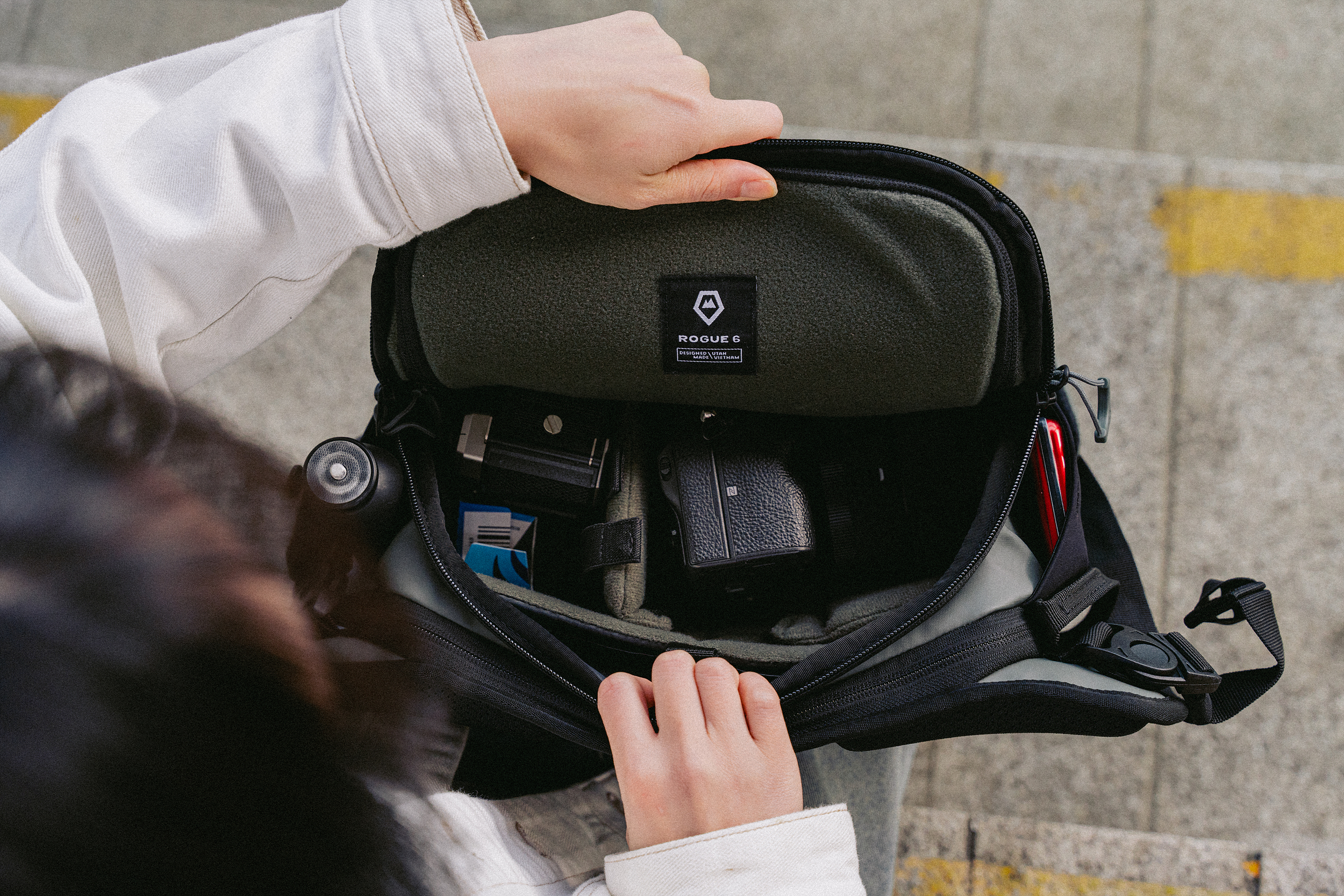 ROGUE 6L Sling V2는 작지만 부족함 없이 장비를 넣고 다닐 수 있게 세팅되어 있어요. 내부를 보면 85mm F1.4 DG DN과 카메라 본체, 그리고 옆 공간에 펜탁스 17을 넣었지만 그렇지 않다면 작은 단 렌즈 정도는 추가로 챙길 수 있습니다. 꼭 이런 구성이 아니더라도 다른 장비 수납을 하고 싶다면 탈착식 디바이더를 통해서 장비에 맞게 탈착 후 장비에 맞게 조정하거나 제거해서 데일리 가방으로도 활용할 수 있습니다.