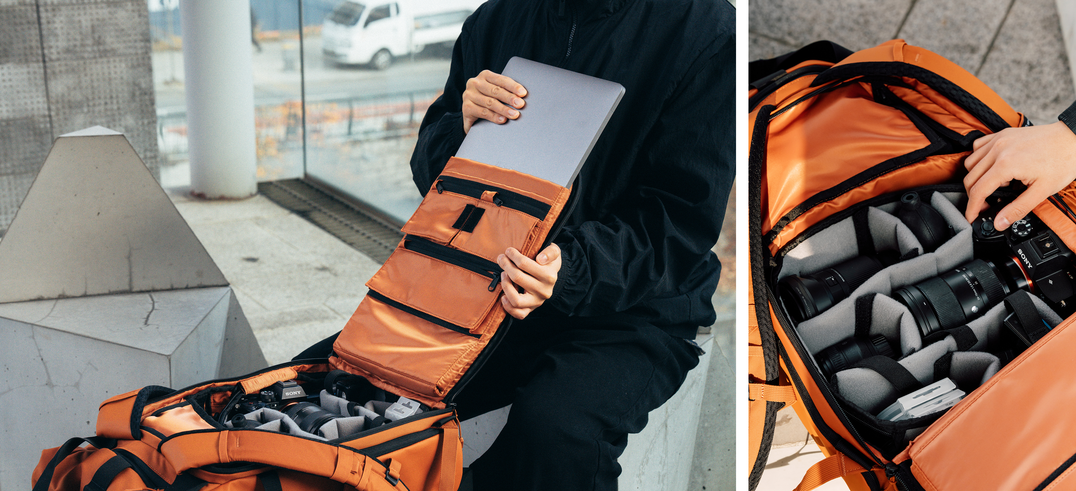 PRVKE 21L V4 제품은 기본적으로 클램쉘 타입이라 등판 부분 전체가 오픈되면서 편리하고 많은 양의 짐을 차곡차곡 쌓을 수 있어서 공간 낭비를 최대한으로 줄일 수 있습니다. 미러리스 1대와 렌즈 2개, 컴팩트 카메라 1대, 메모리카드 케이스, 블로워 등 촬영과 관련된 물품 한 번에 넣어봤는데 큰 무리 없이 챙길 수 있었습니다. 기타 액세서리와 노트북은 카메라 장비와 공간을 분리해서 수납할 수 있어서 편리하더라고요. 아, 노트북은 15인치 맥북이었는데 알맞게 들어갑니다.