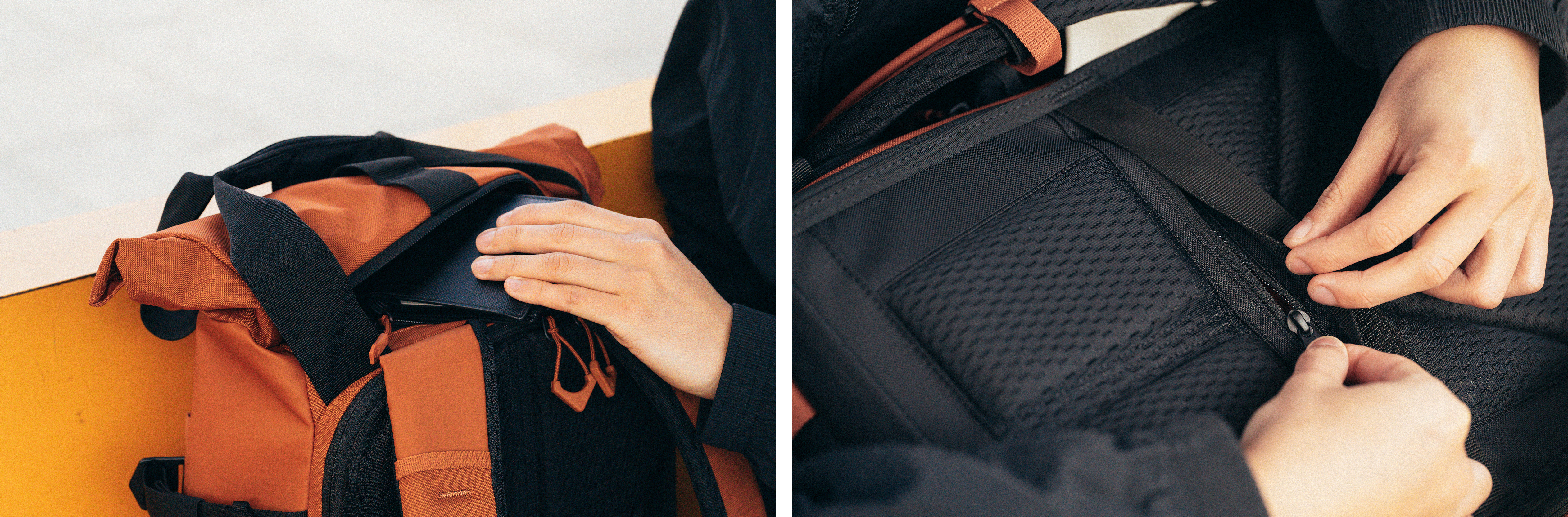 롤탑 쪽에 수납 공간이 2개, 등쪽에 히든 포켓이 있어서 귀중품을 수납하기 좋습니다.