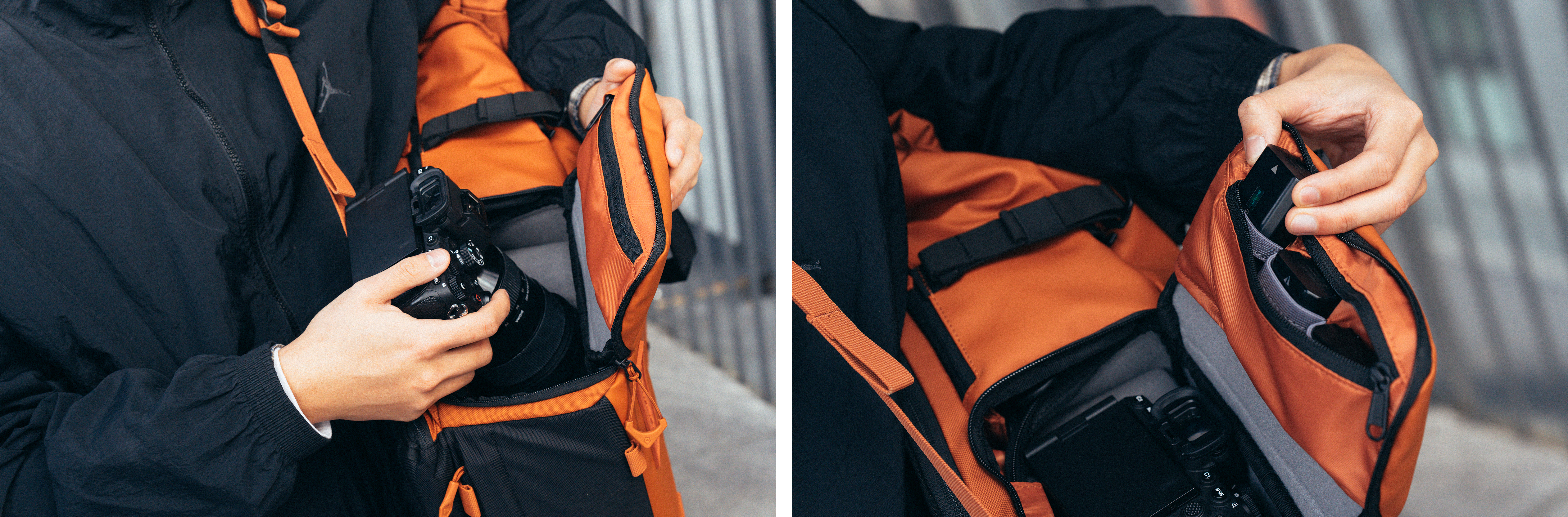 가방을 멘 상태에서도 카메라를 빠르게 꺼낼 수 있도록 측면 입구를 마련해 놓았고, 여기에서 그치지 않고 별도 수납 지퍼를 만들어서 배터리를 3개까지 보관할 수 있어서 배터리 찾는다고 뒤적거리지 않아도 됩니다.