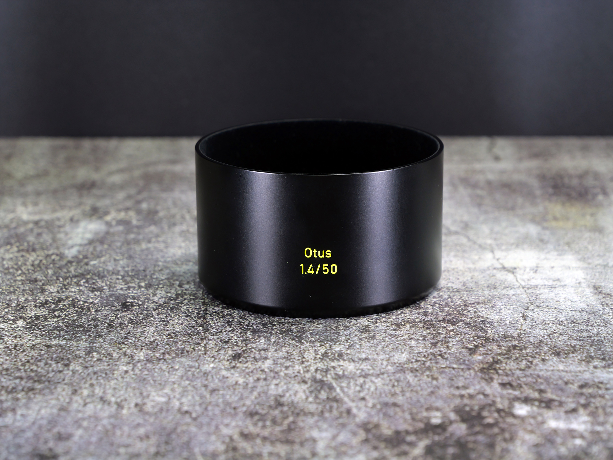 후드를 꺼내보면 손에 딱 느껴지는 그 묵직함이 바로 금속 재질이라는 걸 말해줍니다. 안쪽에는 부직포 처리가 되어 있어서 난반사를 줄여주는 역할을 해요. 전면에는 노란색 음각으로 ‘Otus 1.4/50’이 새겨져 있습니다.