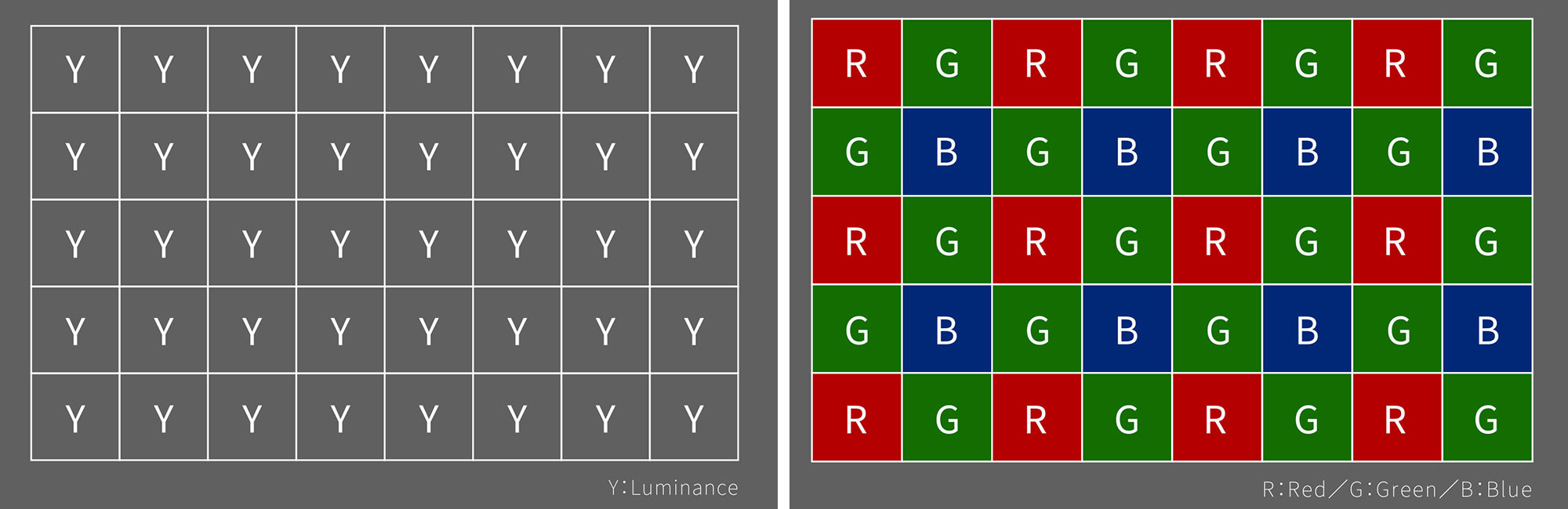 가장 큰 차이는 이미지 센서에 있습니다. GR IV Monochrome은 흑백 전용 CMOS 이미지 센서를 사용합니다. 일반적인 디지털카메라는 컬러 정보를 얻기 위해 센서 위에 색 필터 배열을 두고, 각 픽셀이 빨강·초록·파랑 중 하나의 빛만 받아들입니다. 이후 주변 픽셀의 데이터를 계산해 색을 완성하는 보간 과정을 거치게 되죠. 즉, 컬러 이미지는 센서가 받아들인 빛의 정보와 계산으로 보완된 정보가 함께 만들어낸 결과라고 볼 수 있습니다.
