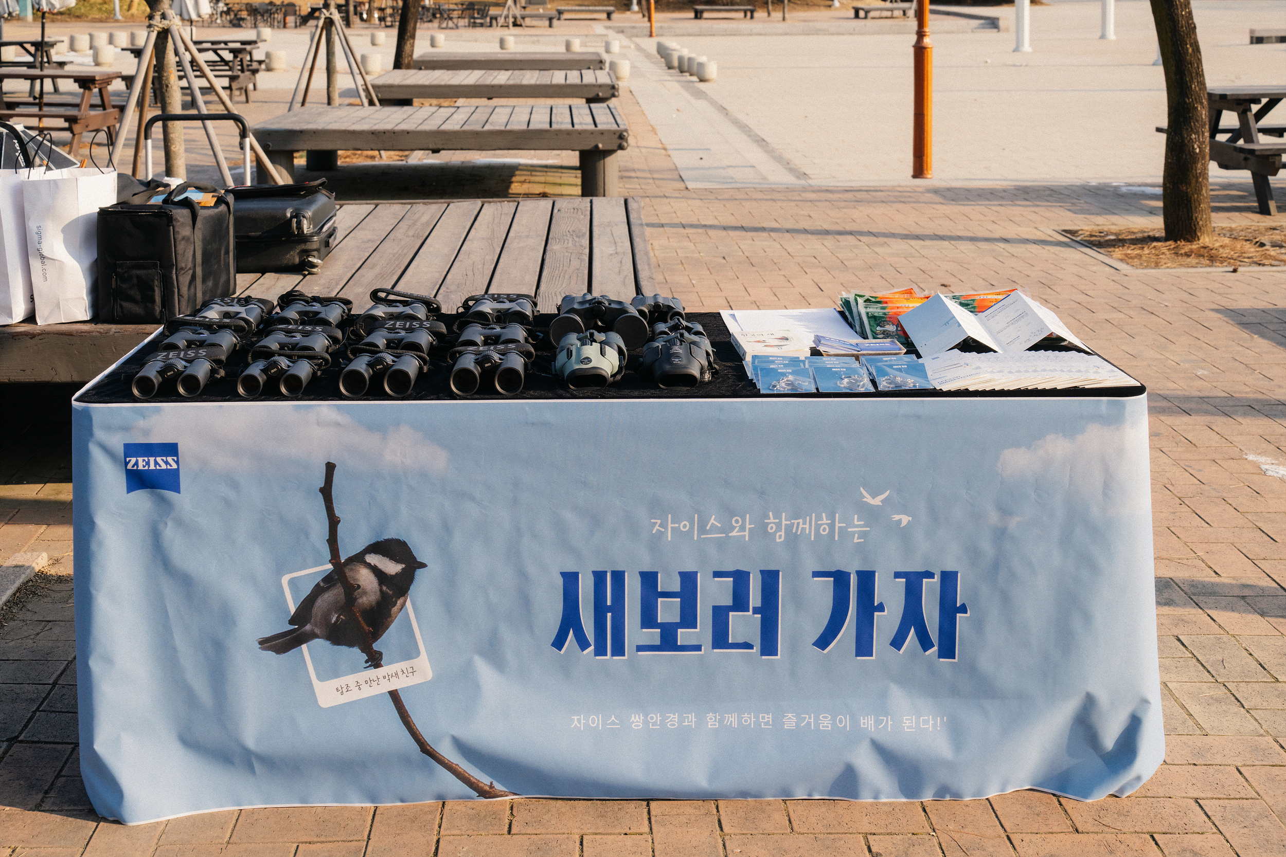 <새보러 가자>는 탐조에 대해서 아는 게 없더라도, 장비를 갖추지 않아도 됩니다. 탐조에 대한 궁금증과 관심만 가지고 오셔도 장비는 저희가 다 준비해 드리니까요. 이번 행사는 광학 시스템에서 독보적인 '자이스'의 제품으로만 준비 했습니다. 쌍안경과 세워두고 볼 수 있는 스코프까지 준비해서 탐조 장비에 대해서 여러가지 준비 했습니다.