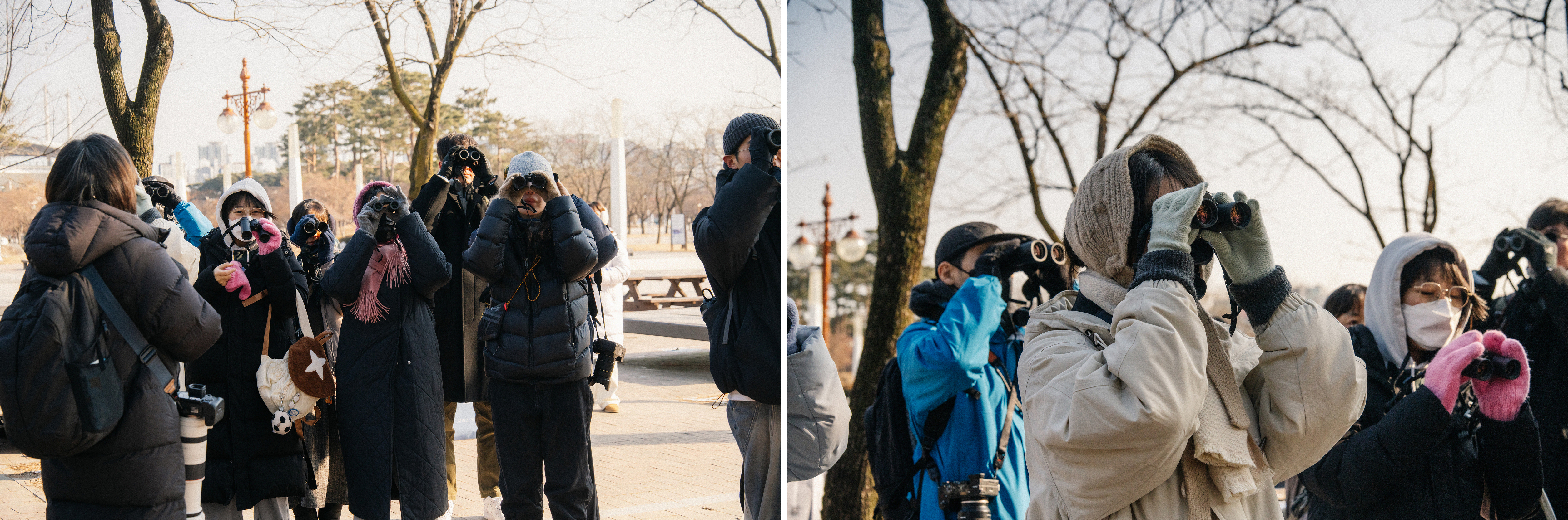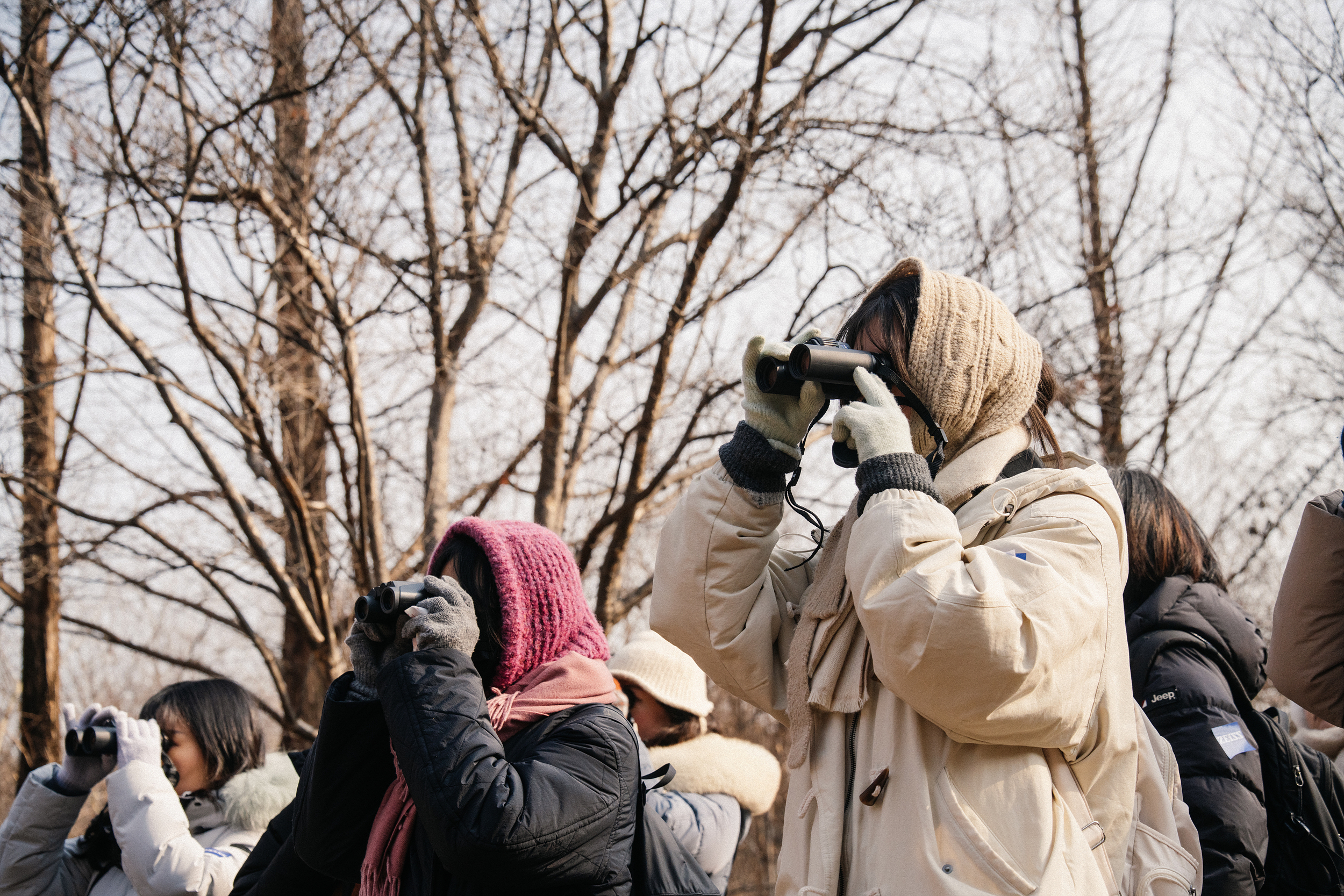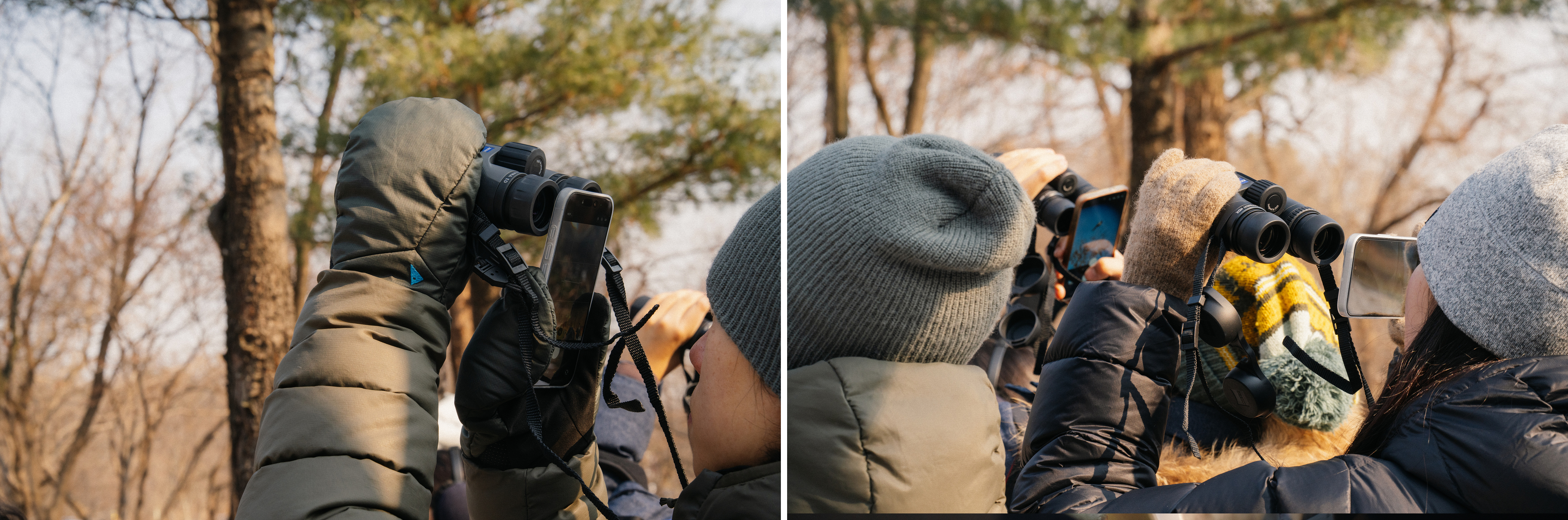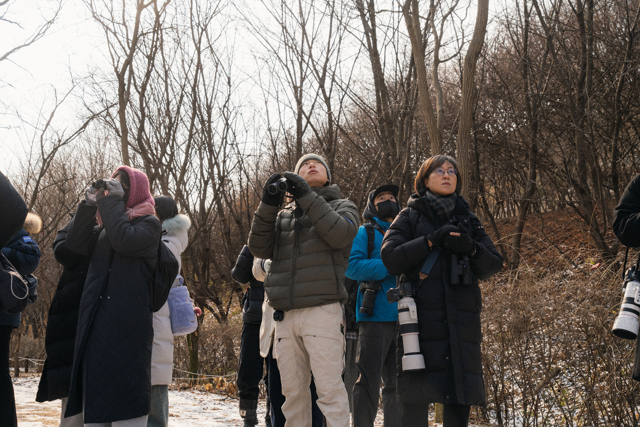 탐조를 하러 마음 먹고 나온 터라 희미하게 들려오는 새 소리에도 어디서 들리는 건지, 혹시 새가 있는 건 아닐까 하면서 보다가 누군가 '저기 있다' 하면 쌍안경을 들고 이리저리 찾아보게 됩니다. 이렇게 몇 번 사용하면 자연스럽게 새를 발견하는 감각도 올라가고, 쌍안경을 능숙하게 사용하게 되면서 점점 탐조에 빠져들게 됩니다.