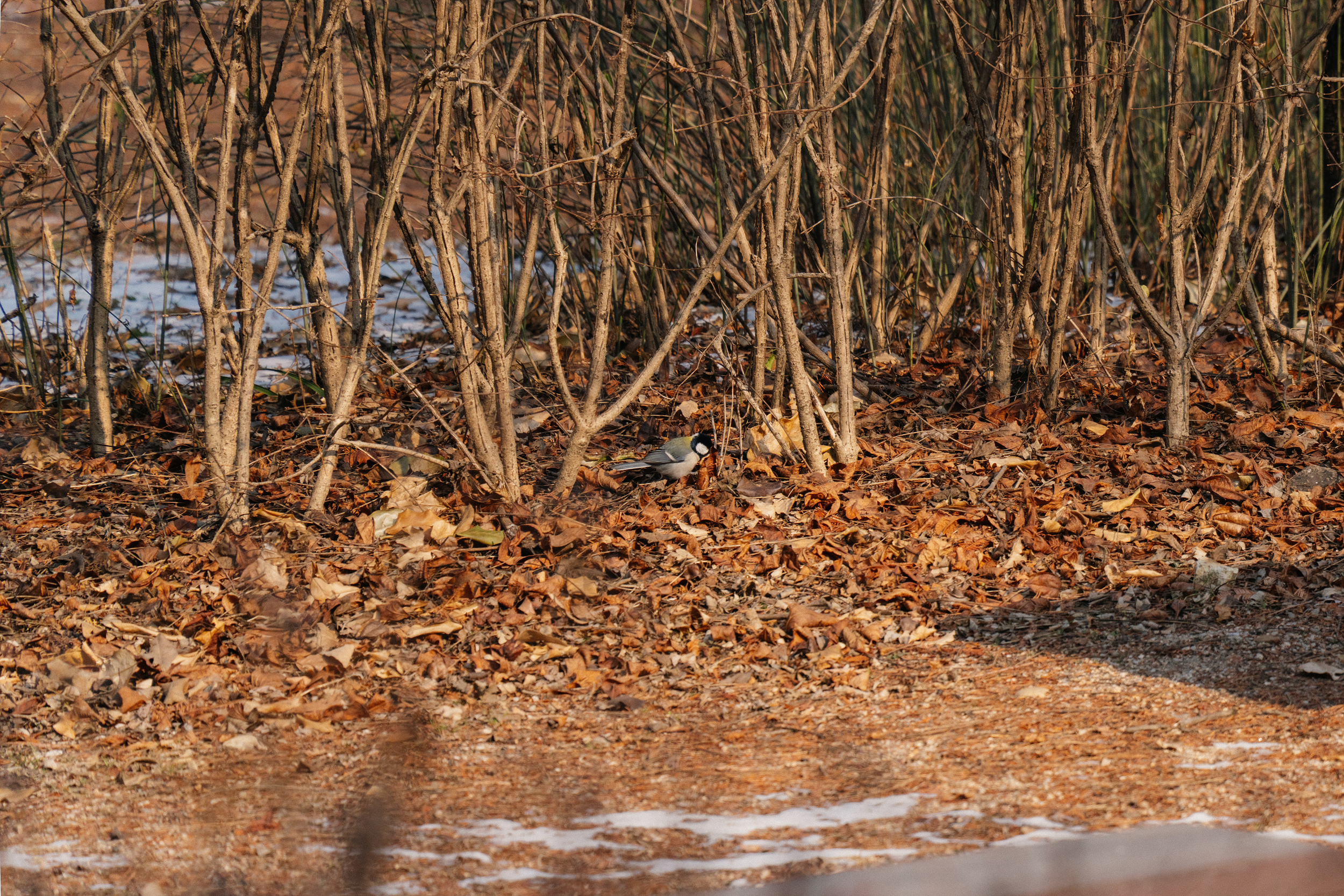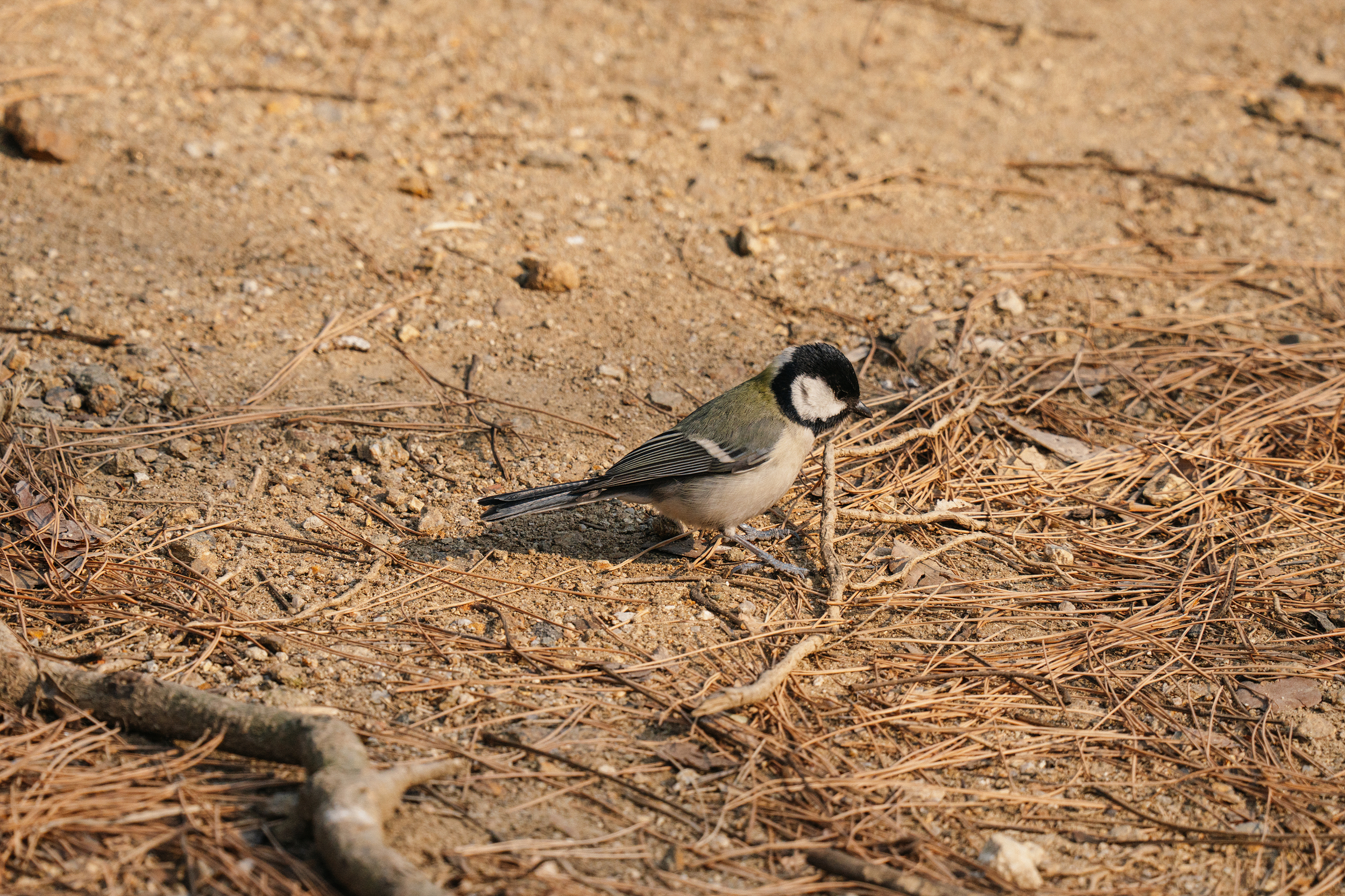 박새입니다. 국내에서 흔히 볼 수 있는 새죠. 바닥에서 먹이를 찾고 있었어요!