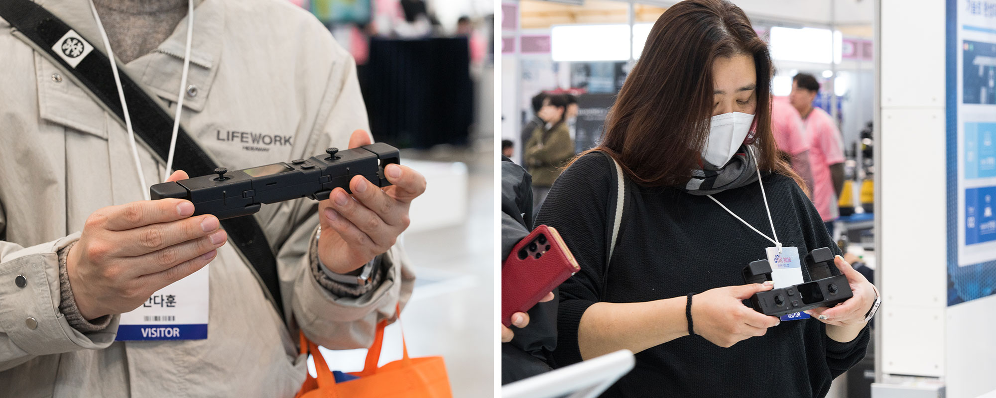 비콘&조이스틱을 살펴보고 체험해 보는 방문객들