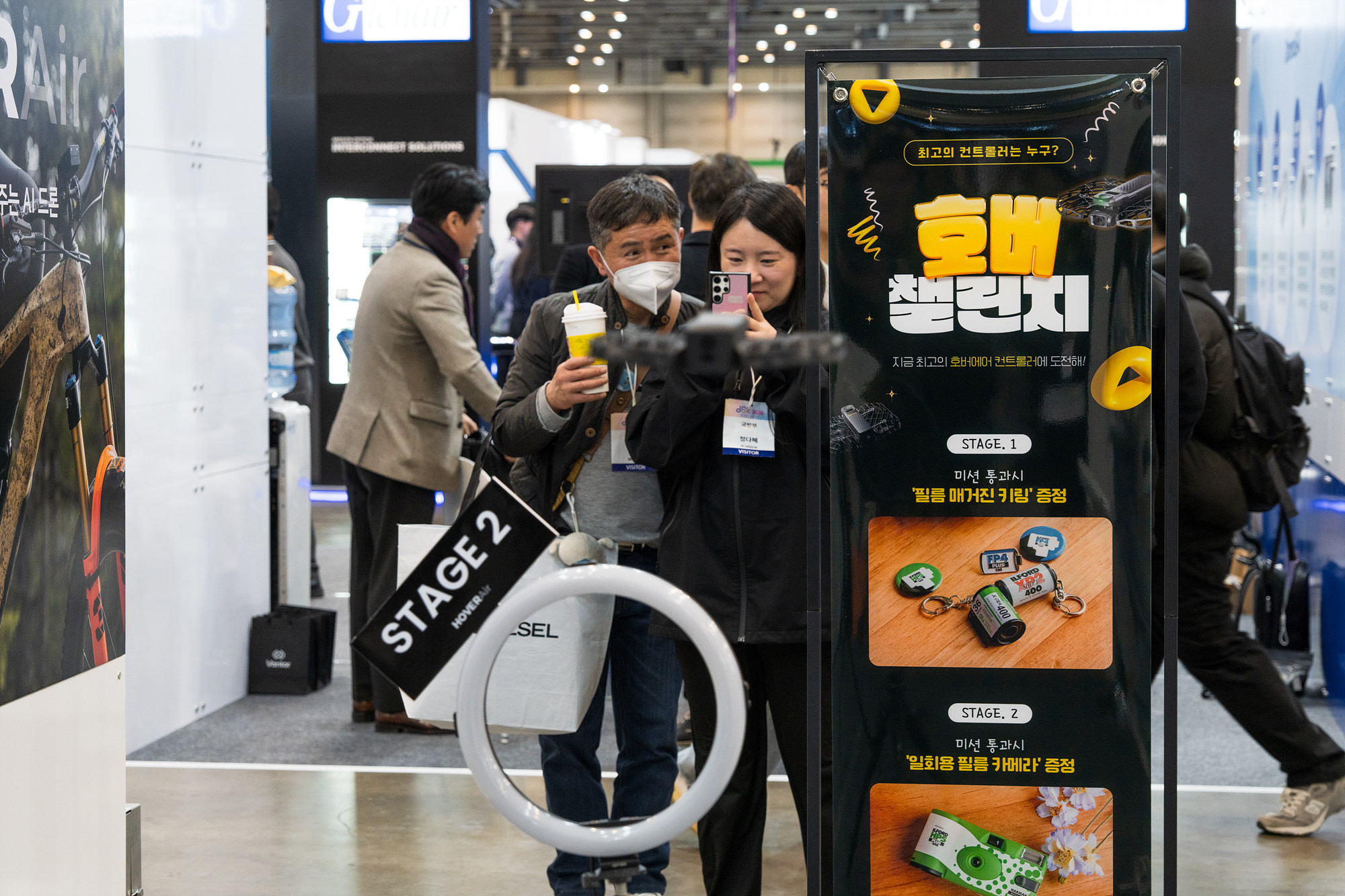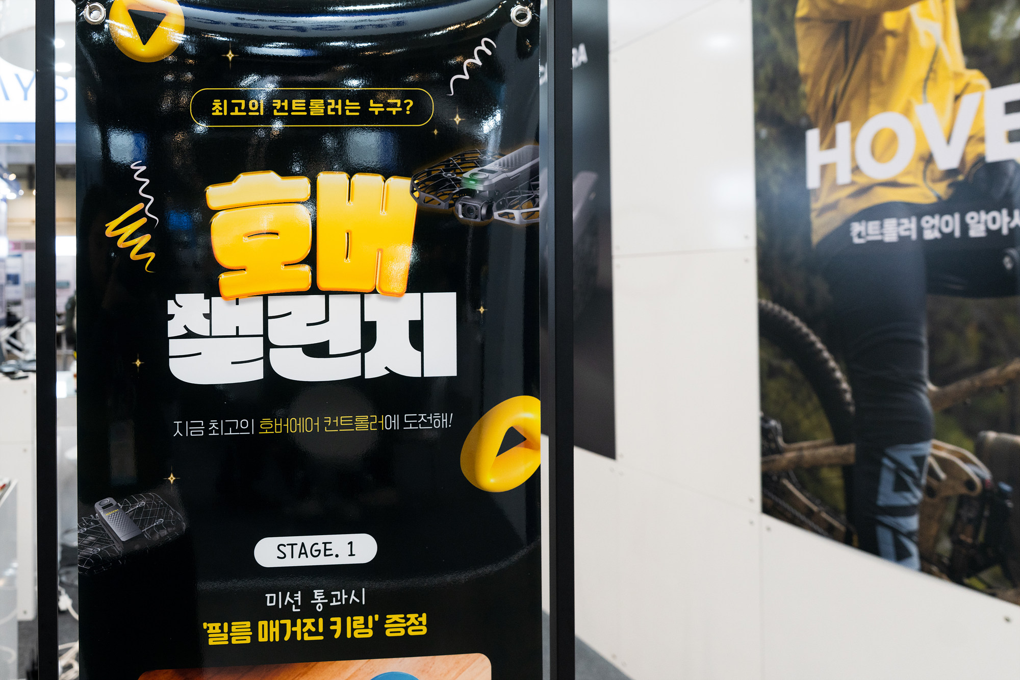 이번 박람회에서 특히 많은 관심을 받은 프로그램은 SNS 이벤트였습니다. 호버에어 전용 앱을 이용해 수동 조종으로 두 개의 링을 통과시키고 마지막 도착 지점에 착지까지 성공해야 하는 미니 게임 형식으로 진행되었습니다. 단순해 보이지만 기체를 정교하게 다뤄야 하는 만큼, 예상보다 난이도가 있는 코스였어요.