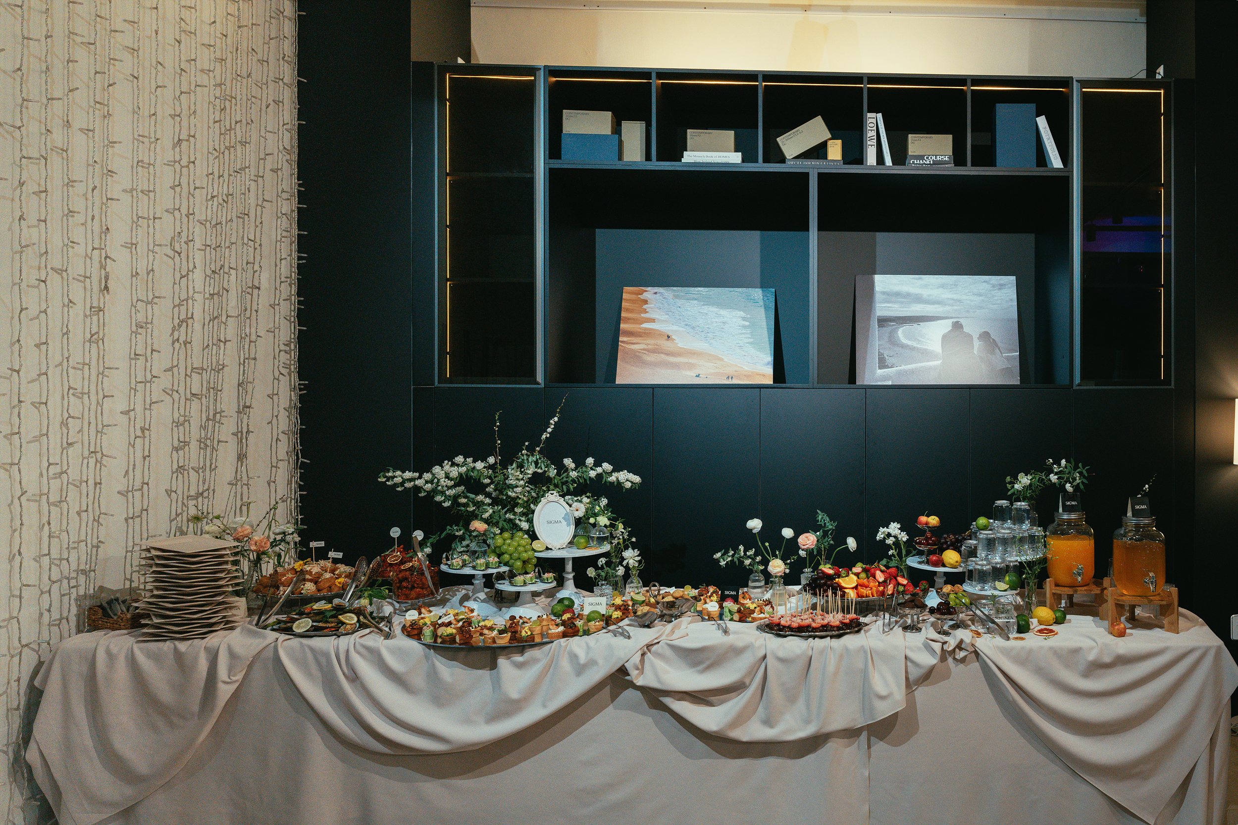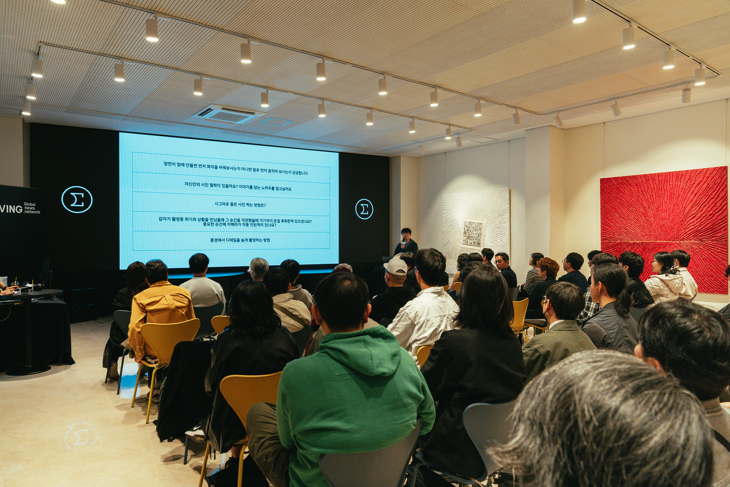 이번 행사는 에이빙뉴스 MIK 베이스캠프에서 진행되었는데 1층부터 3층까지 다양한 경험과 즐길거리를 마련해 놨어요. 오신 분들은 모두 2층으로 가셔서 간단하지만 맛있게 드실 수 있는 케이터링을 시작으로 송철의 작가의 프린팅된 작품 3점과 대형 TV를 통해 몰입감 있게 감상할 수 있도록 갤러리를 구성했습니다.
