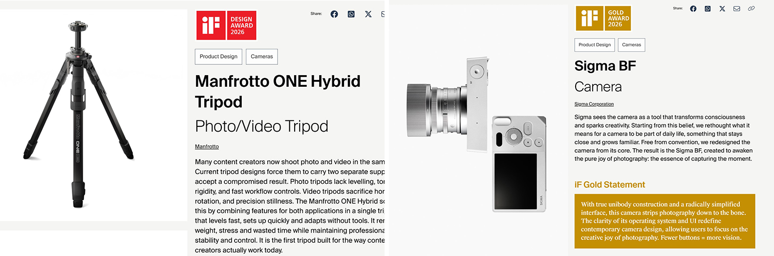 2026년 2월, 세계 3대 디자인상 중 하나인 그중에서도 가장 권위가 높다고 평가받는 iF DESIGN Award의 수상작이 발표되었다. 수상작들의 카테고리 중 [Cameras]에서 단연 눈에 띄는 제품이 있었다. 바로 Manfrotto ONE과 SIGMA BF 카메라. 디자인상이니까 단순히 제품의 비주얼이 뛰어나고 아름답다고 해서 받을 수 있을까? 그렇지 않다. 제품의 디자인뿐만 아니라 아이디어(Idea), 형태(Form), 기능(Function), 차별화(Differentiation), 지속가능성(Sustainability) 등 5가지의 핵심 가치를 고루 갖췄는지에 대한 전방위적인 심사가 이루어진다. 매년 1만여 개의 출품작들 가운데 129명의 글로벌 디자인 전문가들로 구성된 심사위원단의 까다로운 심사과정을 통과해야만 iF 로고를 거머쥘 수 있다.