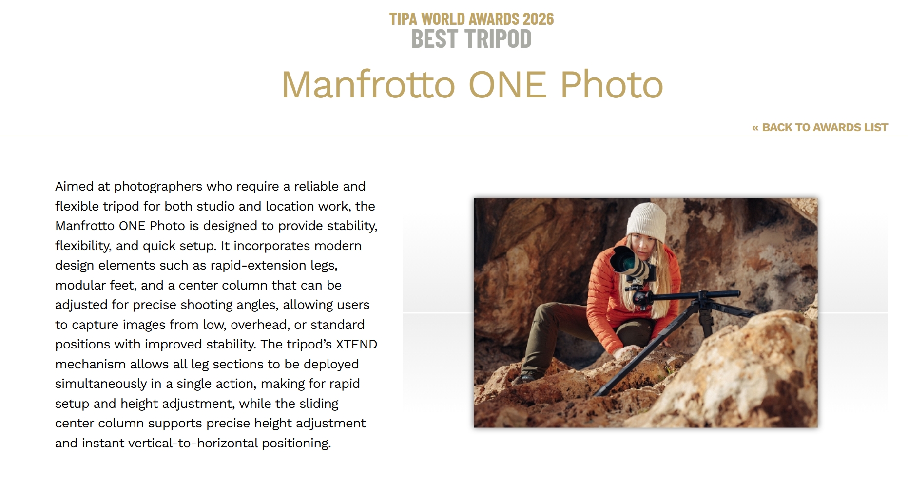 올해 최고의 삼각대는 맨프로토 원 포토 삼각대가 차지했다. 맨프로토 원 하이브리드 삼각대가 iF 디자인 어워드 수상한 데에 이어 ONE 라인업으론 2관왕이다. 심미적인 아름다움과 현장에서의 실용성 모두 인정받아 2026년 최고의 삼각대로 우뚝 올라섰다. 아직 국내에 정식 출시되진 않았지만 이미 세계적으로 그 성능을 확인받은 셈이다.