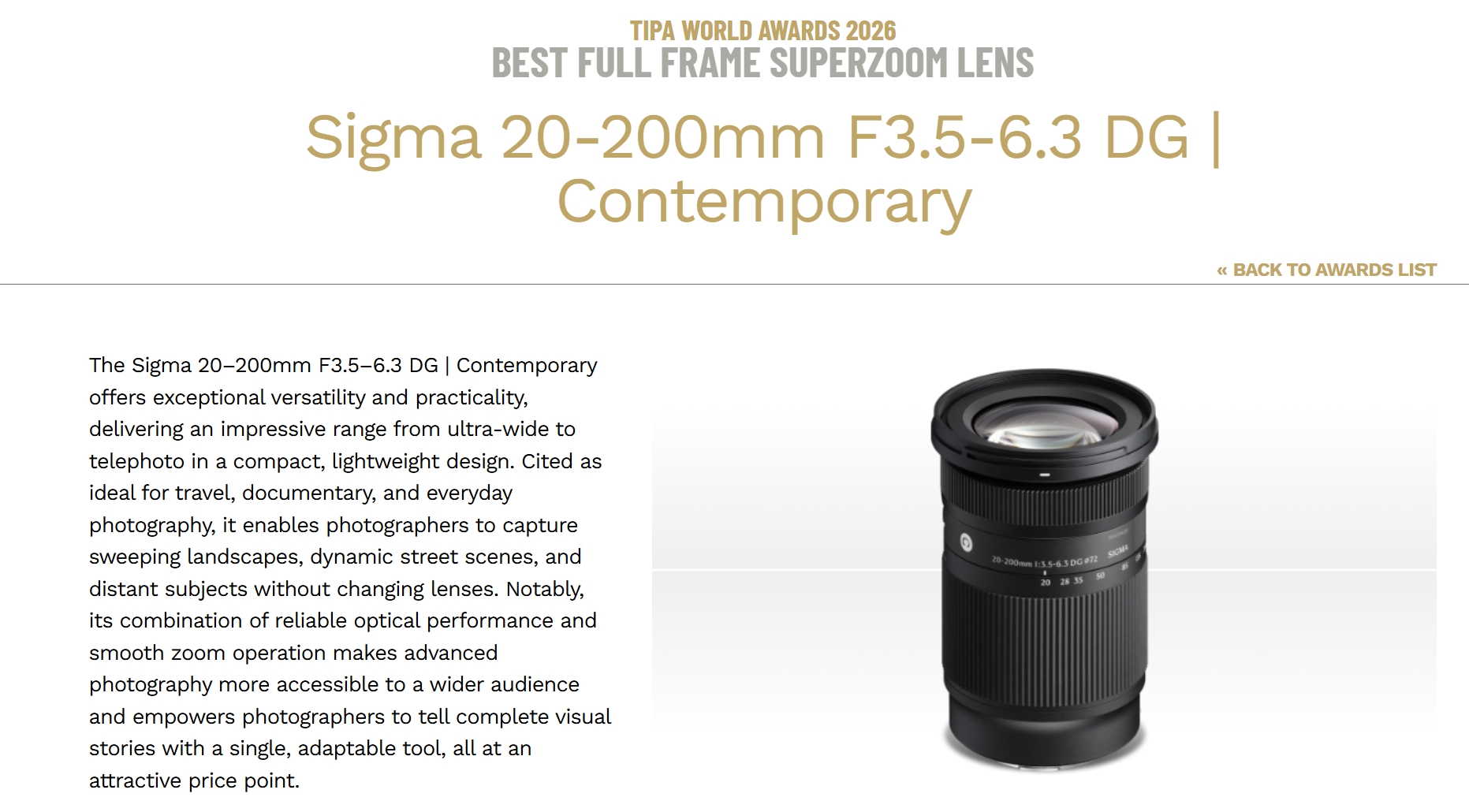 SIGMA 20-200mm F3.5-6.3 DG | Contemporary가 당당히 올해 최고의 풀프레임 슈퍼줌 렌즈상을 차지했다. 시그마는 기존 슈퍼줌 렌즈 화각의 시작인 24~28mm에서 초광각이라 불리는 20mm까지 영역을 넓힘으로써 그 한계를 허물었다. 20mm 초광각이 선사하는 광활한 풍경부터 200mm 망원으로 포착하는 역동적인 스포츠 장면, 그리고 일상 스냅과 인물 촬영까지 이 렌즈 하나면 렌즈 교체 없이 거의 모든 상황에 대응할 수 있다.