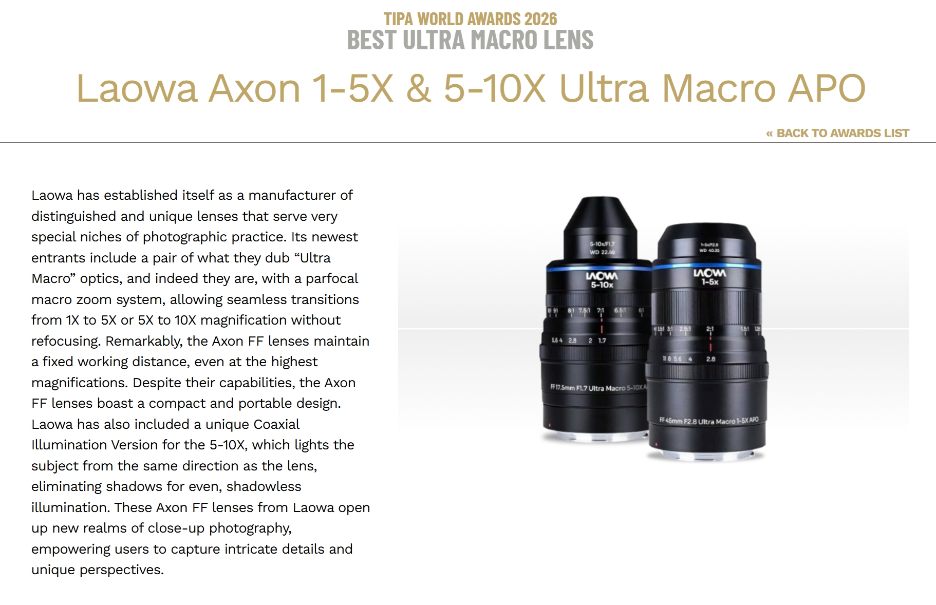 Laowa Axon 1-5X & 5-10X Ultra Macro APO가 올해 최고의 초접사 렌즈상을 당당히 거머쥐었다. 이 렌즈가 수상할 수 있었던 이유는 기존 매크로 렌즈가 갖고 있던 한계와 불편함에 정면으로 도전했기 때문이다. 줌 전 구간에서 워킹 디스턴스(렌즈 전면부와 피사체까지의 거리)를 일정하게 유지하는 파포칼 설계를 세계 최초로 매크로 줌에 적용함으로써, 1배에서 10배까지 끊김없이 배율을 넘나드는 것이 비로소 가능해졌다. 기존 매크로 촬영 시 배율을 변경할 때마다 카메라와 조명의 위치를 재조정해야 하는 번거로움을 해결한 것이다.