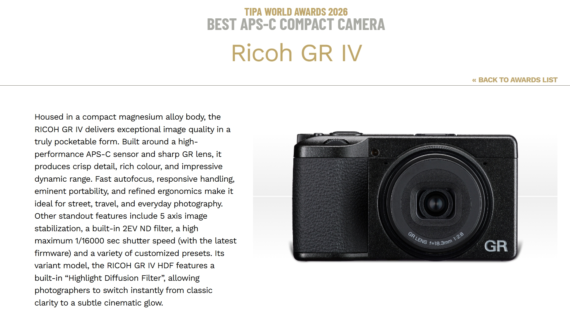1996년에 출시된 GR 1을 시작으로 약 30년이 지난 지금까지 이어지고 있는 GR 시리즈의 TIPA 어워드 수상은 필름과 디지털 시대를 관통하며 여전히 최고의 컴팩트 카메라임을 증명하는 동시에 GR이 지키고자 했던 본질이 무엇인지 우리에게 다시금 알려주는 계기가 되었다.