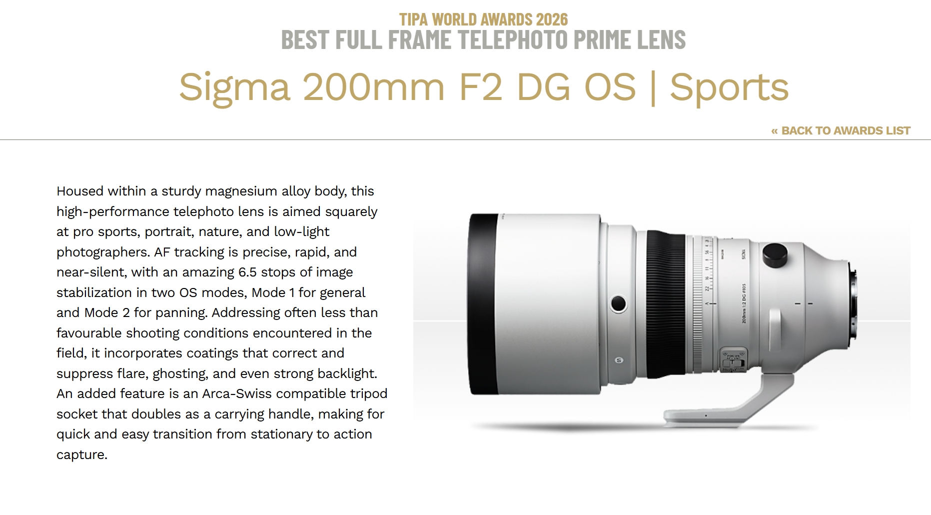 2025년, 시그마는 세계 최초의 풀프레임 미러리스 단렌즈 200mm F2 DG OS | Sports를 선보였다. DSLR 시절 '꿈의 화각'이라 불릴 만큼 전문가의 영역으로 굳어졌던 200mm 단렌즈가 풀프레임 미러리스 렌즈로 출시된 것이다. 모두의 긴 침묵 끝에 세상 밖으로 나온 시그마 200mm의 희소성과 혁신성, 그리고 이를 뒷받침하는 광학 성능은 세계 각국에 포진되어 있는 심사위원들의 마음을 움직이기에 충분했다. F2 단렌즈가 만들어내는 강력한 배경 흐림, 저속 셔터에서도 핸드헬드 촬영이 가능할 정도의 강력한 6.5스톱 손떨림 보정, 야생동물·스포츠·인물 등 다양한 상황에서 대응할 수 있는 AF 추적 속도 및 성능, 최대 개방에서도 타협 없는 주변부 화질까지.